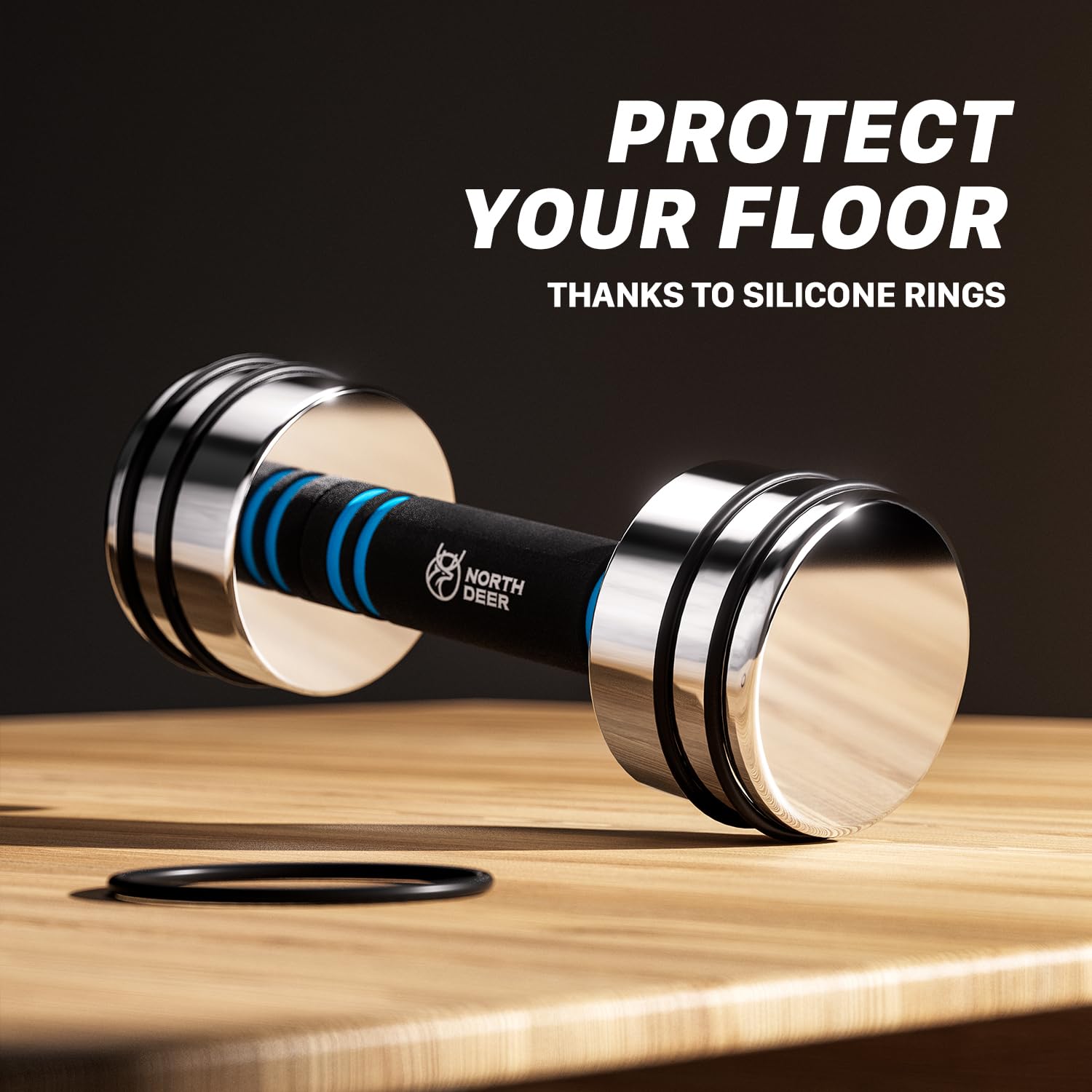 • SUITABLE FOR HOME USE: Convenient due to its small size, easy storage, and ability to be placed upright. It is made of steel without plastic wrap and will not emit unpleasant odors, which would usually affect the mood of your exercise. The minimalist shape and highly polished surface give people the feeling of artwork in the home. The attached rubber rings can be easily installed in the groove of the dumbbell to avoid abrasions to the floor.