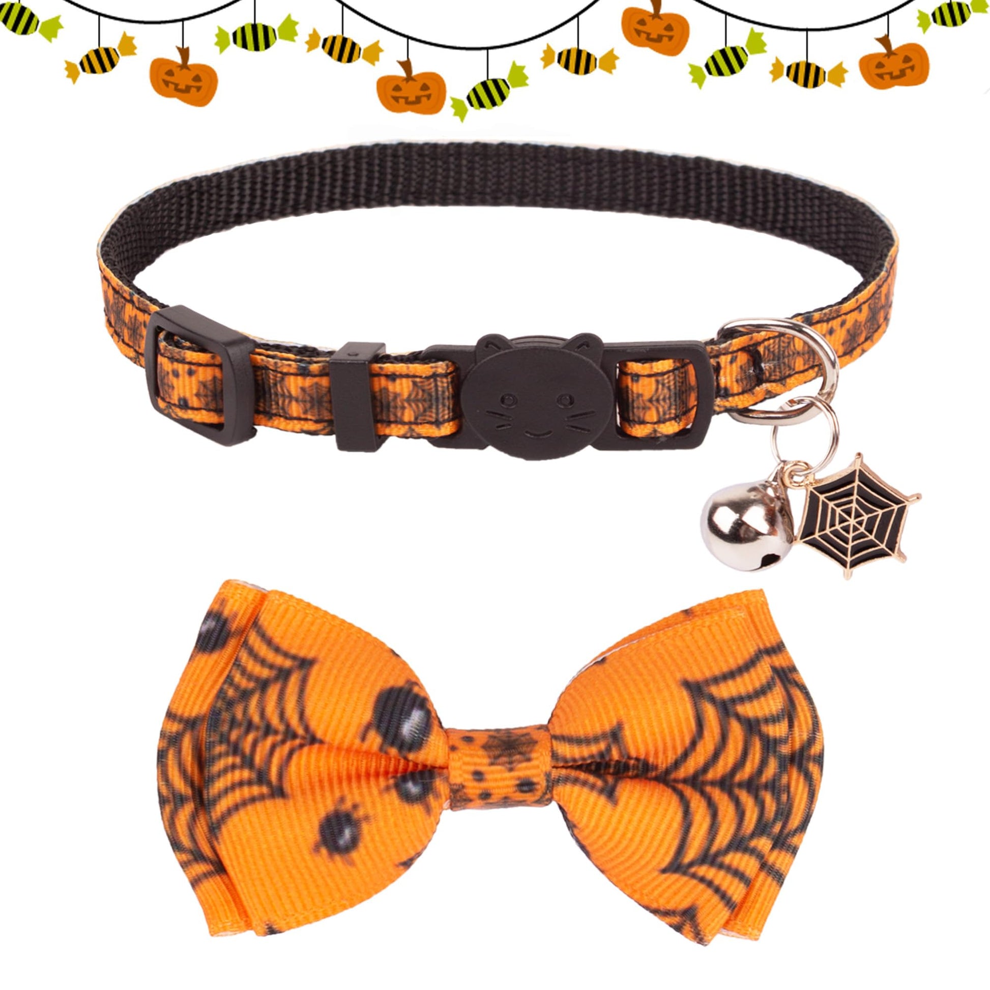 ADOGGYGO Halloween Cat Collars with Bow Bell, Breakaway Kitten Bowtie Collar Spider Web Skull Halloween Collars for Girl Boy Cats Kittens