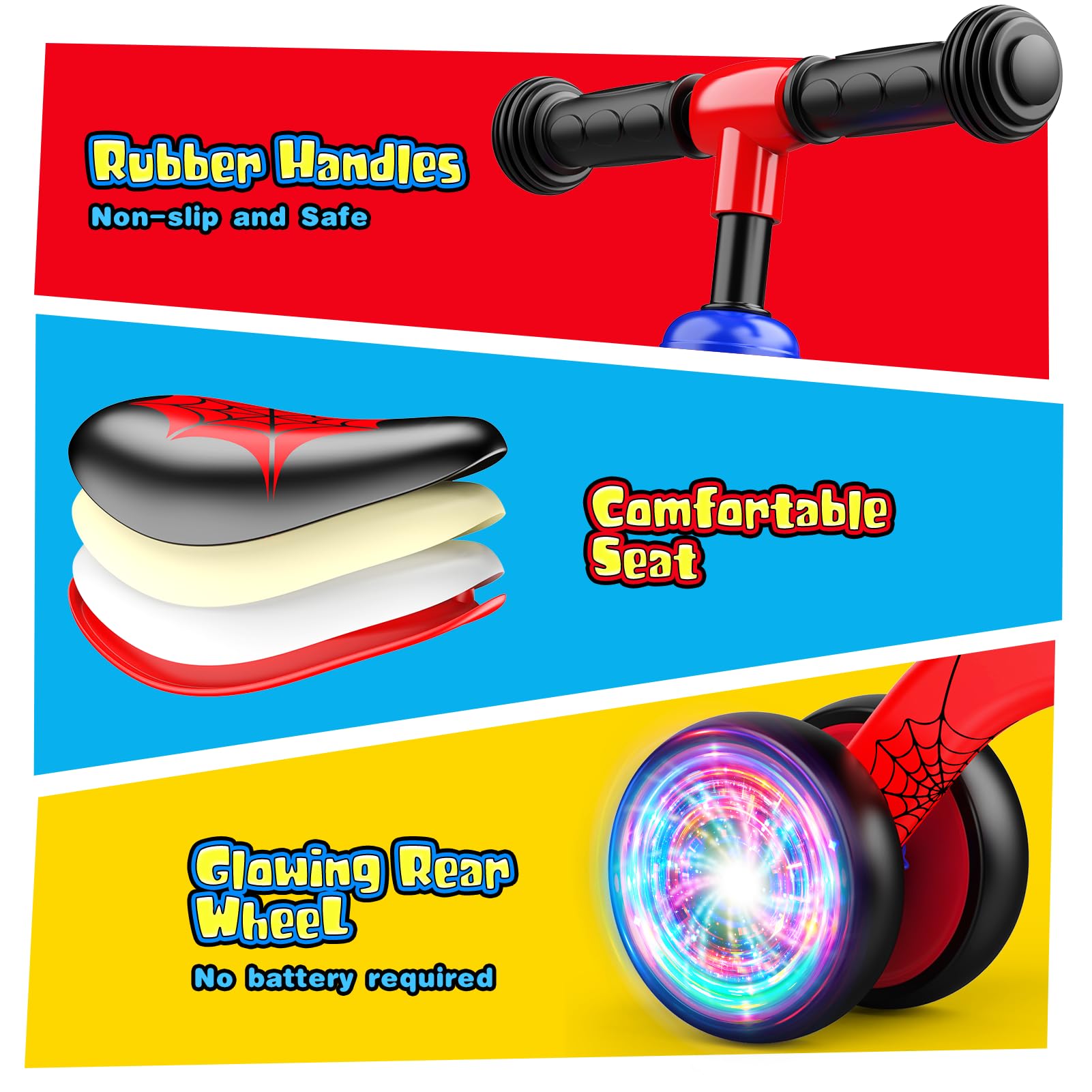 • 【Spider & Lighting Design】Our baby balance bike features a uniquely cool spider design that is not only visually distinctive but also full of fun, capturing your baby's attention and stimulating their curiosity and desire to explore. With no need for batteries, simply spinning the rear wheel will emit colorful lights