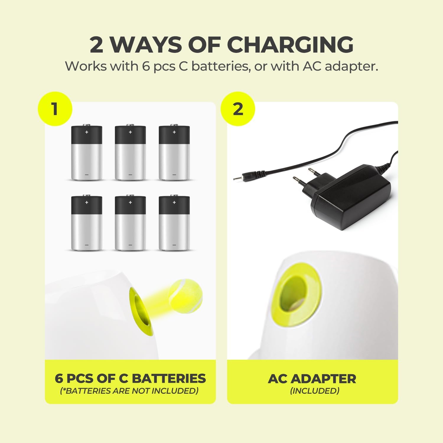 • Ball Launcher Includes: Be part of the global trend and treat your furry friend to an unforgettable playtime experience! The package includes three special size tennis balls, ensuring you can start playing fetch with your pet right away. The All For Paws Automatic Ball Launcher can be powered with 6 pcs C batteries (not included) or the included AC adapter for your convenience.