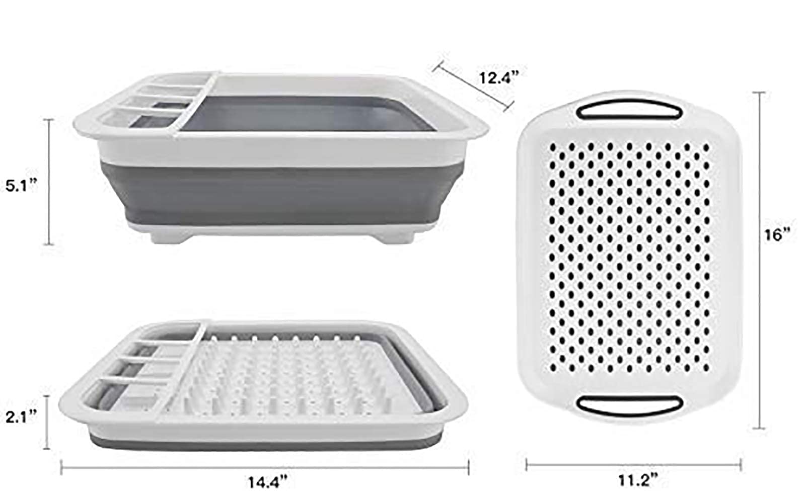 2) A great choice for small apartment kitchens and camp kitchen equipment. This compact dish drain collapses down to two-fifths of its original height for easy storage in a cabinet or under the sink when you're finished, one of the best rv accessories for travel trailers.