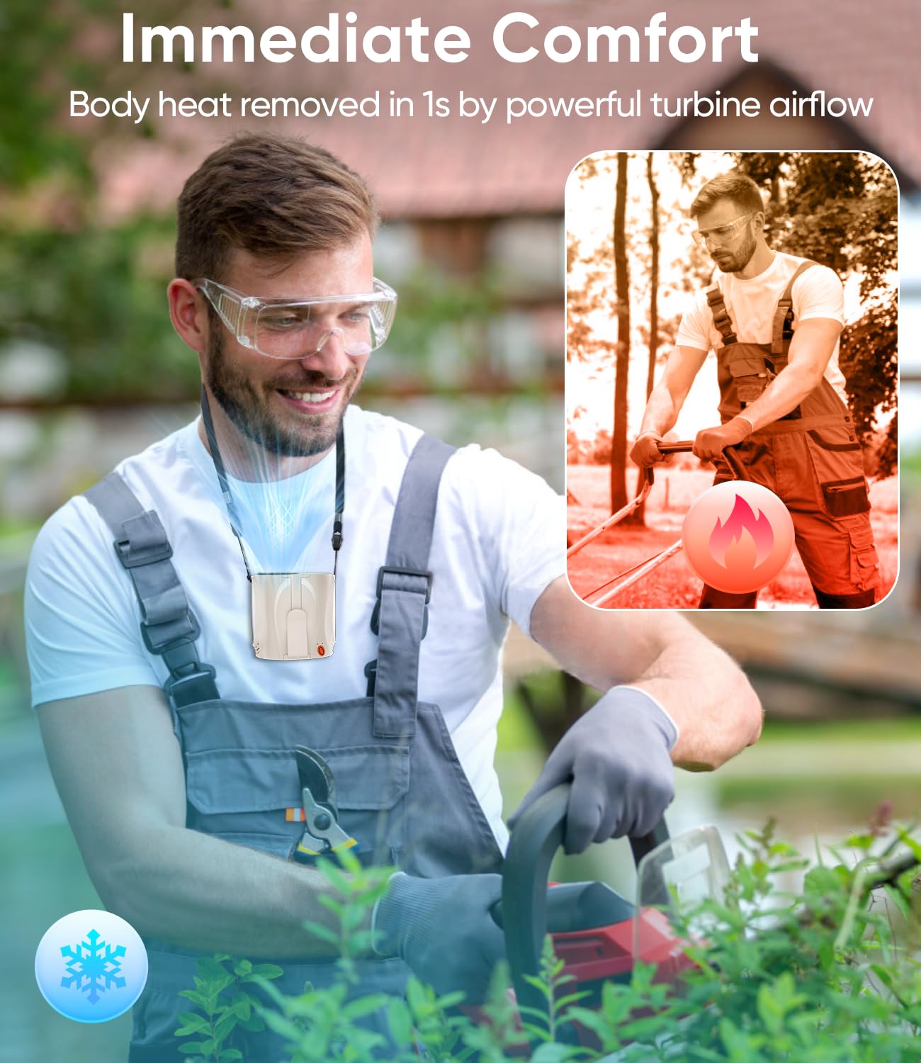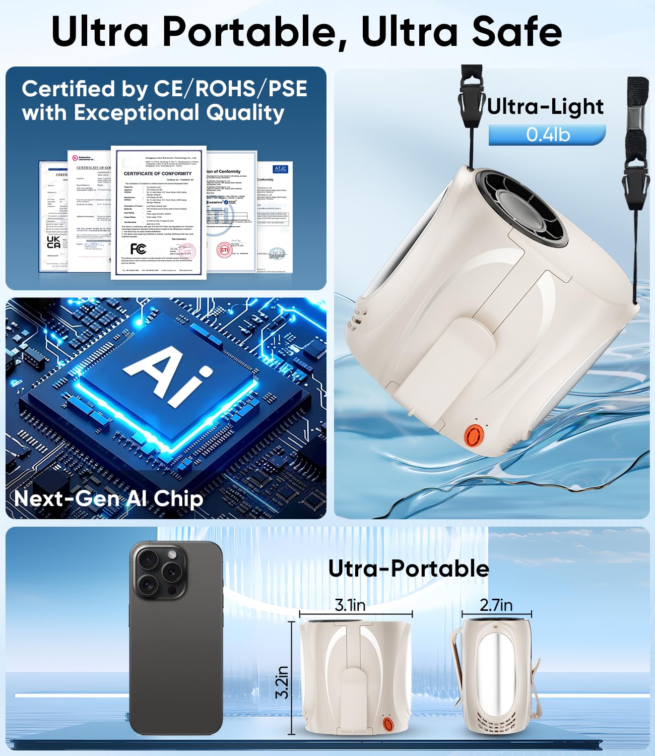 • [Extended Runtime & Fast Charging] Equipped with a 6000mAh industrial-grade battery, this personal fan delivers 10-40 hours of uninterrupted cooling on a single charge. Built-in the latest AI smart safety chip, and passed multiple security certifications such as CE/FCC/RoHS, providing you with a safe cool breeze.