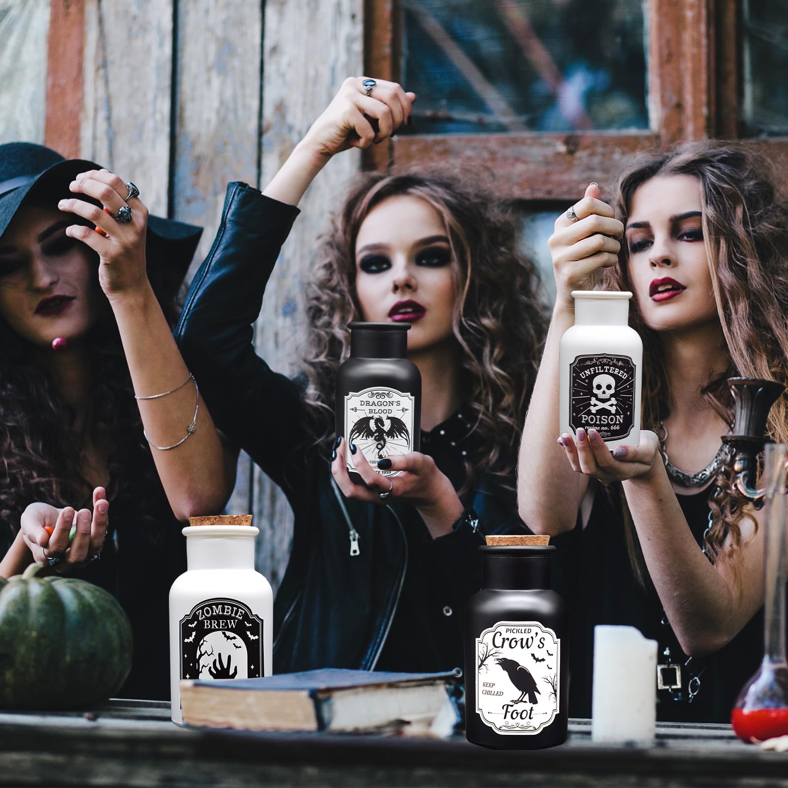 Ainswei Halloween Decorations Indoor, 4 Potion Bottle with Cork, 12PCS Label Halloween Stickers, Black and White Apothecary Glass Bottles, For Tiered Tray Table Home Room Halloween Decor