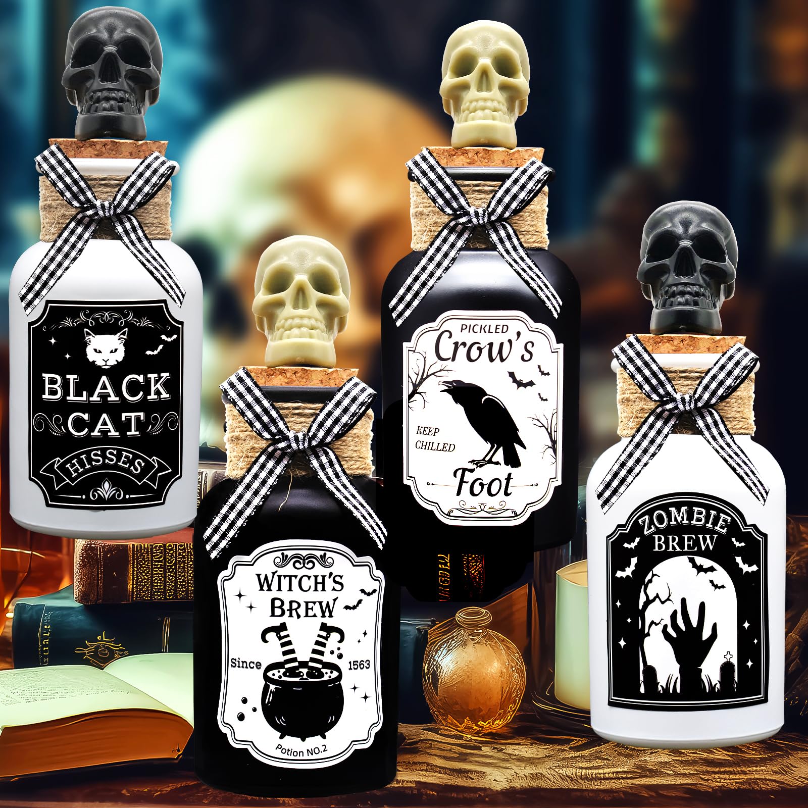 • Halloween Decoration Set: Includes 4 apothecary glass bottles with cork, 12pcs Halloween-themed stickers, 4pcs black and white checkered bows and 4pcs mini Halloween skeleton head. Above, a total of 24pcs. It will become the most eye-catching indoor decoration for Halloween.