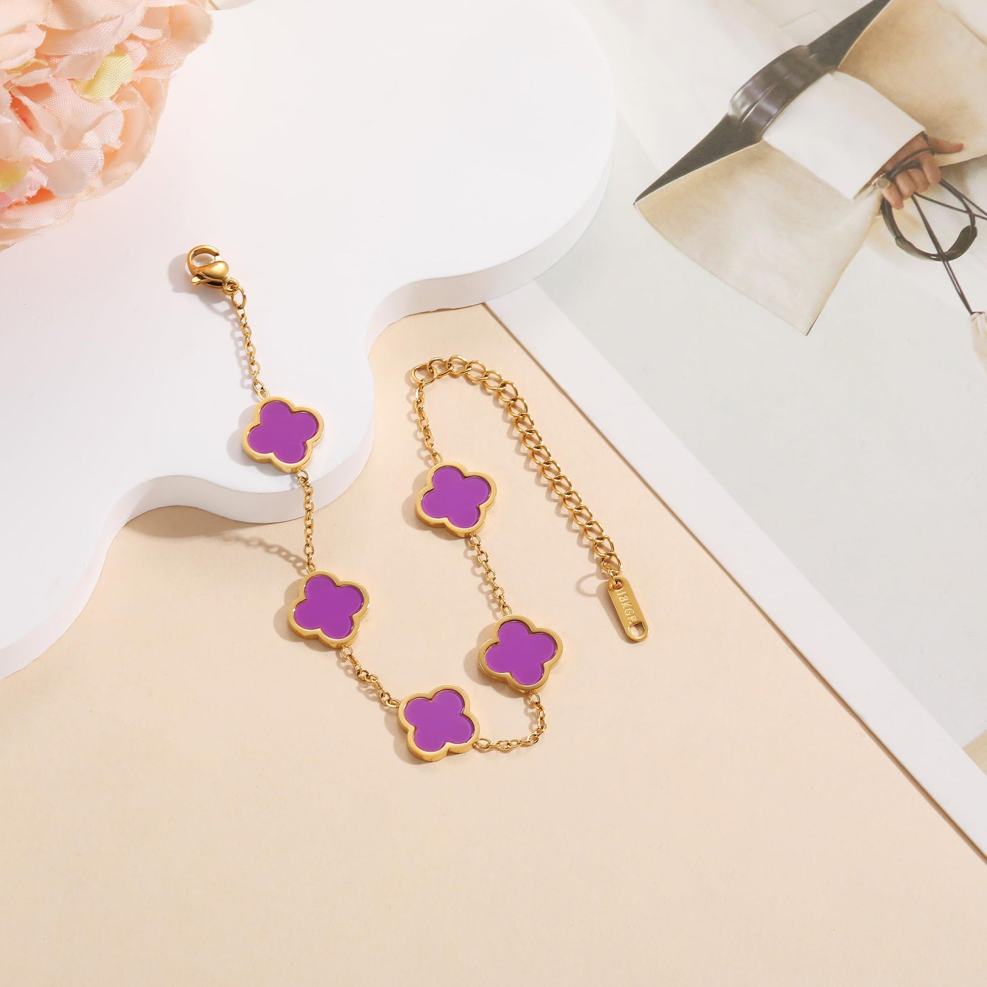 AIPPK 18K Gold Plated Clover Lucky Bracelet for Women White/Black/Red/Green Flower Four Leaf Link Bracelets Trendy Jewelry Gifts for Women (Purple)