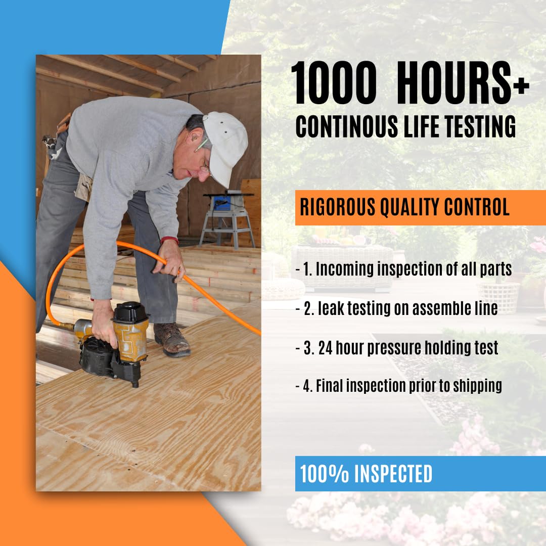 • ONLY 68 dB: The best air compressor for working in residential or commercial areas, our whisper quiet air compressor uses an induction motor with a low speed of only 3240 RPM provides smooth and quiet operation while delivering reliable compressed air supply, which means you can run inside the house, in a workshop, or on a jobsite without interrupting others.