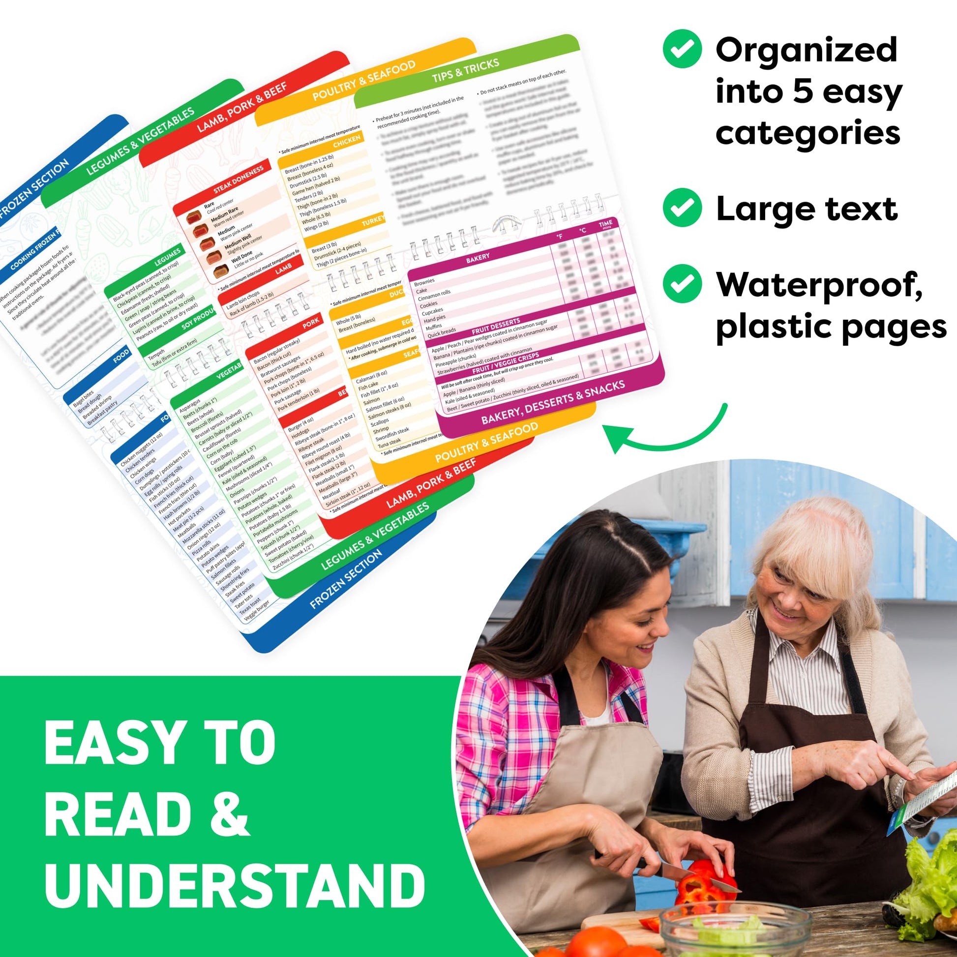 • More Than Just an Air Fryer Cookbook. This air fryer cheat sheet includes steak doneness guides, internal meat temperature tips, frozen food handling, plus legumes, vegetables, desserts, and snack sections. Designed as the ultimate cooking reference and air fryer accessory, it supports better outcomes and creative experimentation for every user and every meal.
