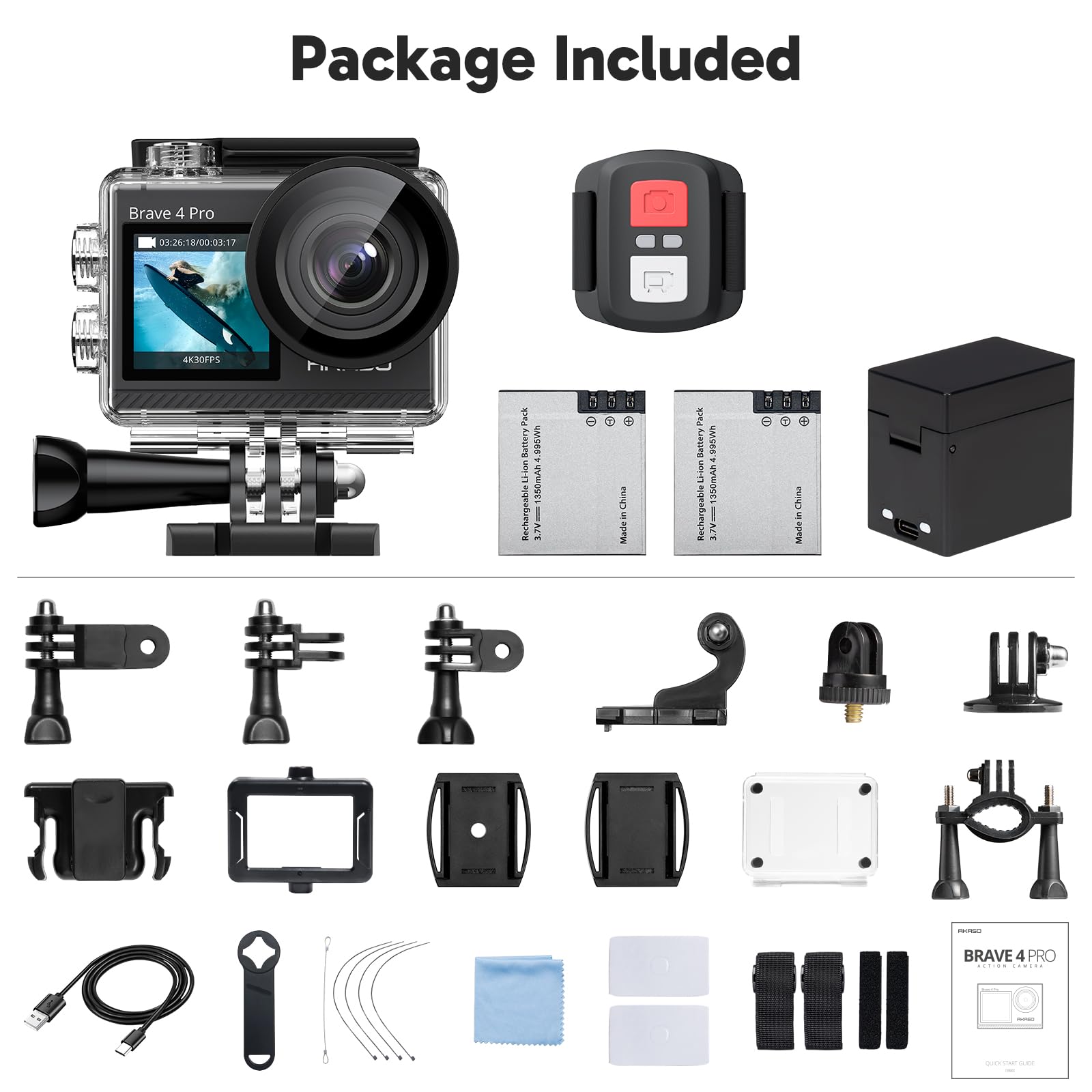 • FREE VALUABLE ACCESSORIES: This underwater camera comes a USB Dual Charger and 2 rechargeable 1350mAh batteries, remote control wristband, and other accessories kit, the kits are available for most kinds of cameras even Gopro. Each battery can record up to 90 minutes. The remote wristband is not waterproof. External microphone not included, please buy AKASO external microphone.