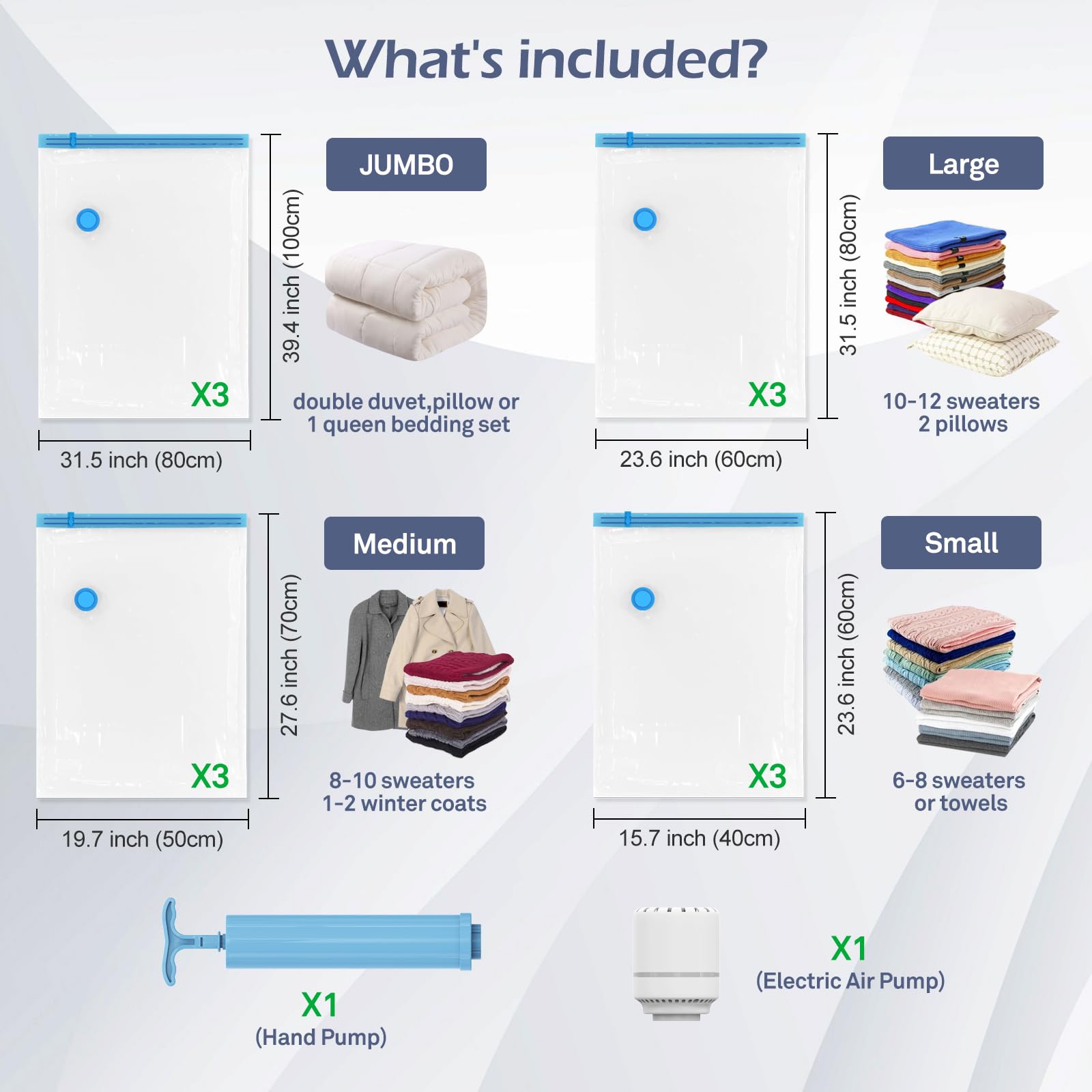 • Multiple Size Choice: Our vacuum storage bags are offered in a full range of sizes, include 3 Jumbo Storage Bags (39.4 x 31.5 in), 3 Large Storage Bags (31.5 x 23.6 in), 3 Medium Storage Bags (27.6 x19.7 in), 3 Small Storage Bags (23.6 x15.7 in), perfect for a range of items! Store your clothes, coats, duvet, bed sheets, towels, blankets, and more.