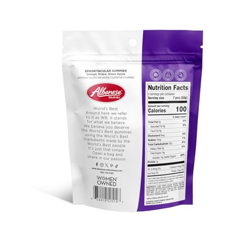 Details: Spooky has never looked - or tasted - sweeter! Sink your teeth into Orange flavored jack-o-lanterns, Grape kittens and Green Apple broomsticks. With bold flavors and a softer chew, Albanese gummies aren’t just candy; they’re an experience. One bite and you can taste the difference! We’ve been crafting gummies and chocolates in the heart of the Midwest for over 40 years, earning the title of World’s Best from our die-hard fans – as well as a spot in their hearts (and bellies!).