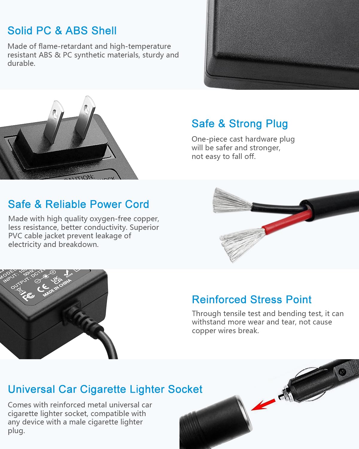 • 【Multiple Safety Protections】Designed with safety in mind. Built in automatic over voltage protection, over current protection, over temperature protection and short circuit protection. Nothing is more important than security. Just plug it into AC outlet, get your car devices used at home now!