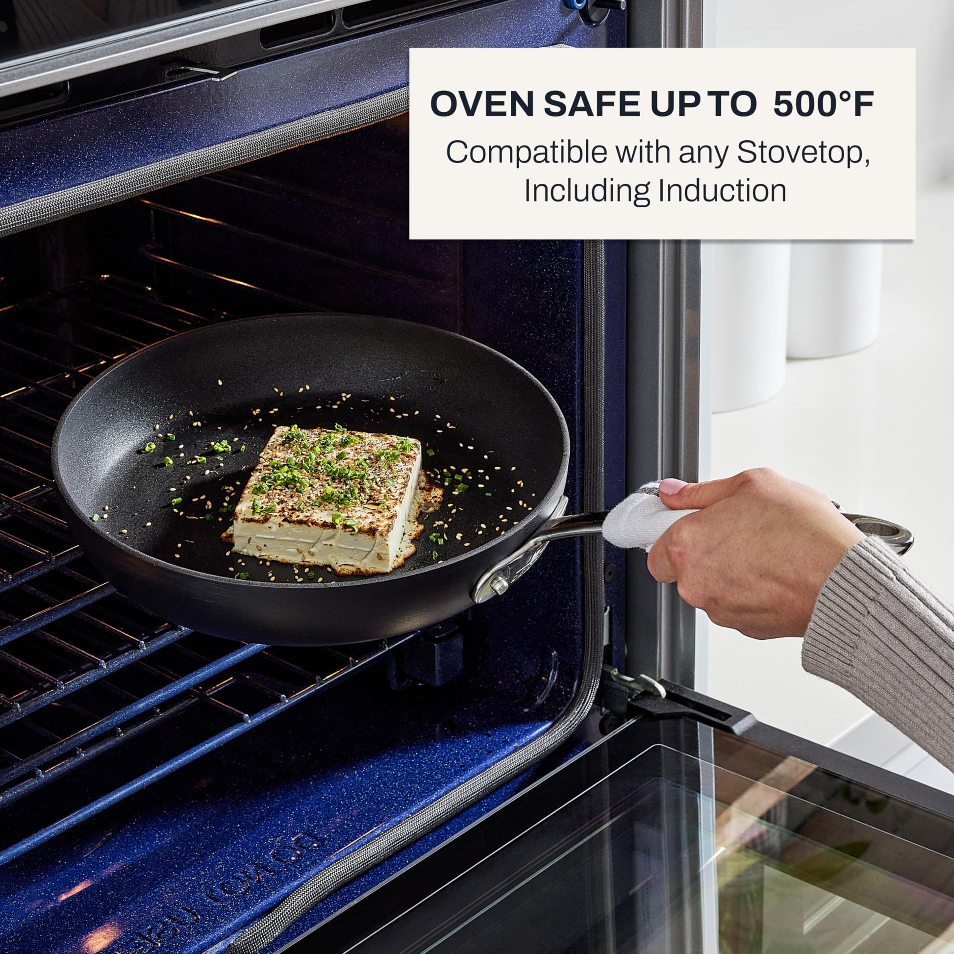 • Oven safe up to 500°F and compatible with any stovetop, including induction Dishwasher safe To preserve the nonstick, wash your cookware with a soap and sponge, and using silicone, nylon or wooden utensils