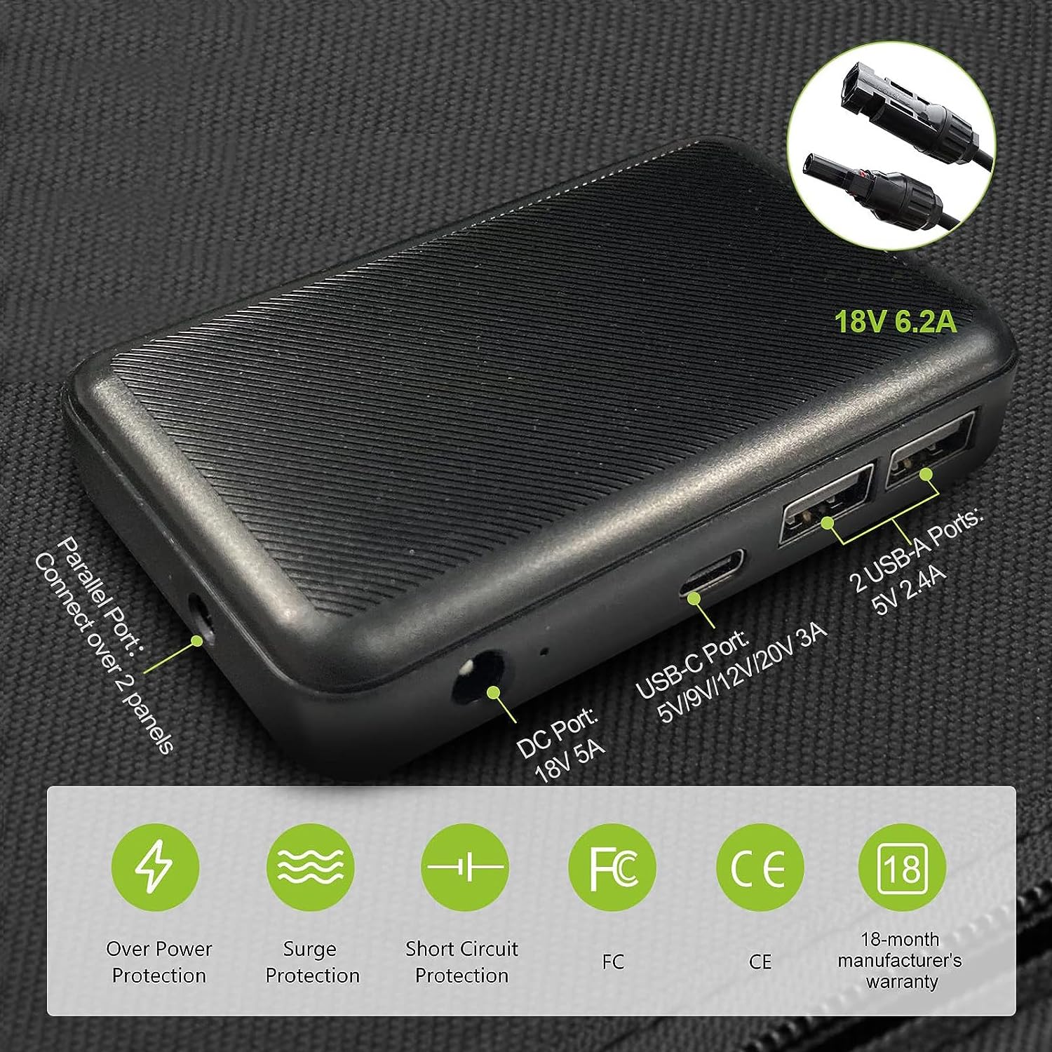 • ▶5 Output For Your Need: Solar-M-C-4 Output can deliver 25A(max)current, Dual USB-A port(5V/2.4A per port) for charging your 5V powered gadgets, and 18V DC outputfor charging your 12V car battery and portable generators, PD60W USB-C output for charging your laptop fastly. The junction box parallel connecting port for connecting multiple foldable solar panel.