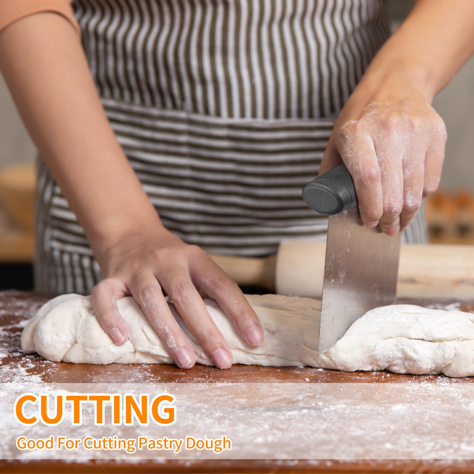 • Multi-purpose Dough Cutter:The bench scraper is a perfect gadget for household. The versatile kitchen utensils are not only designed to scrape dough effortlessly but can also be used as a kitchen scraper, baking scraper, dough knife, cake scrapper.Or used as a smoother for cake decorating or batter spreader. It's perfect to your kitchen essentials.