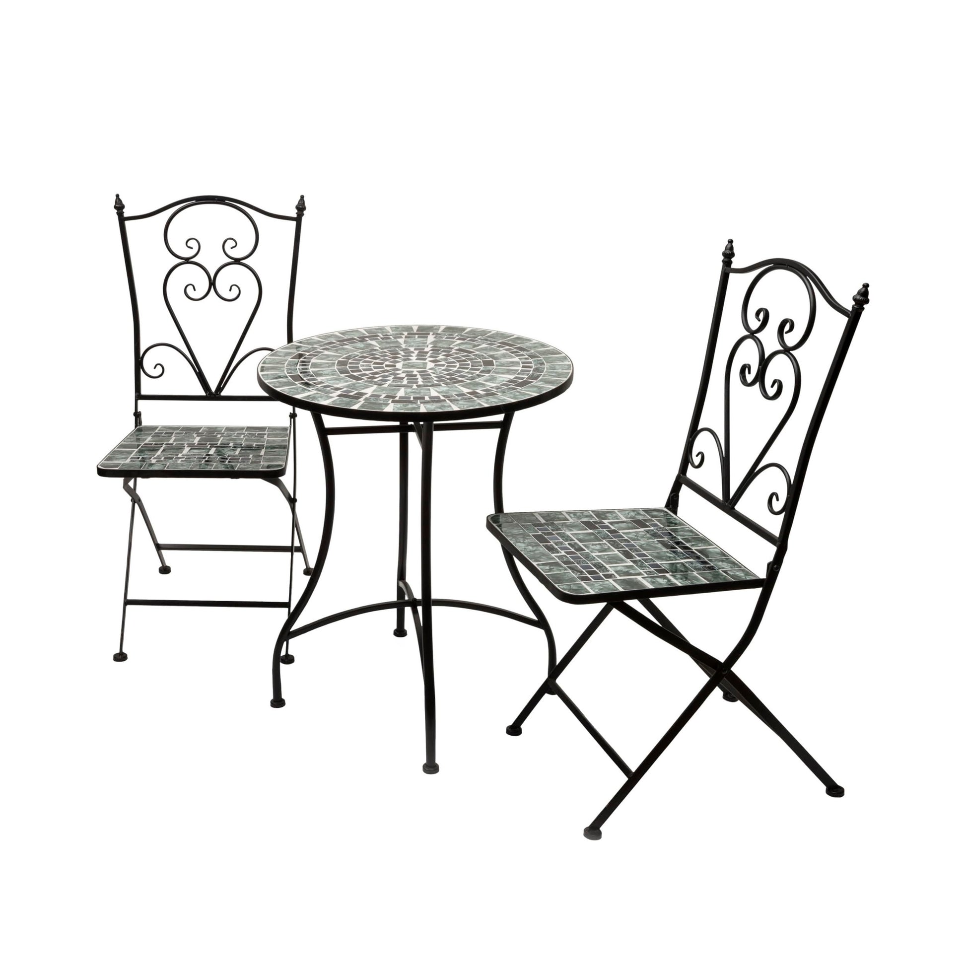 Details: Enjoy friendly conversation and a cappuccino with the Indoor/Outdoor 3-Piece Bistro Set from Alpine Corporation. This decorative marbled glass mosaic table and chairs set will add a unique and elegant addition to your garden, courtyard, or indoor living area. The 3-piece set includes a table and 2 folding chairs and is perfect for smaller outdoor spaces, like apartment balconies or studio apartment eating areas. Skillfully crafted from tough, long-lasting and weather-resistant iron and finished with a chic and sophisticated glass mosaic tabletop and seats. The patio set is durable, and provides reliable, sturdy, and stable seating for 2 people. All 3 pieces are lightweight and the chairs are foldable, making them easy to pick up and transport to your preferred outdoor area for al fresco dining or enjoying your morning coffee indoors in your breakfast nook. They're also compact and easy to store when you're not using them. This table and chairs set is easy to maintain and clean. Simply wipe down with water and a mild soap or detergent to keep it looking brand new. The folding bistro table measures 24'L x 24'W x 28'H and chairs measure 17'L x 21'W x 38'H, and includes a one-year manufacturer's warranty from date of purchase. Alpine Corporation is one of America's leading designers, importers, and distributors of superior quality home and garden decor products. Alpine's award winning in-house design team continuously develops new and innovative 'statement pieces' for your home and garden. Your outdoor living spaces will be the envy of the neighborhood with our wide assortment of fresh, fashionable and contemporary products, from beautifully crafted solar garden stakes featuring patented motion and fiber optic lighting technology to gorgeous glass and glow-in-the-dark birdbaths and feeders.