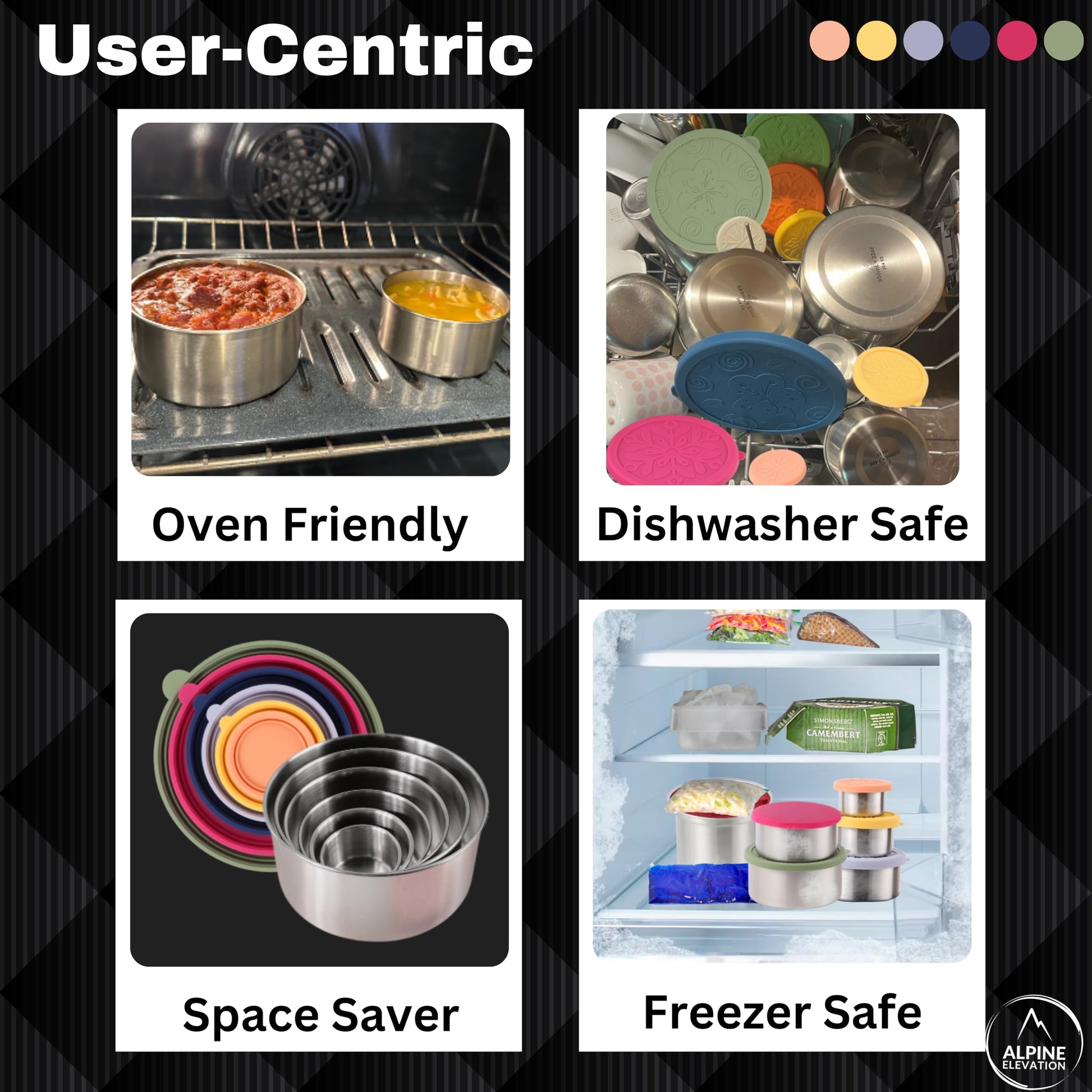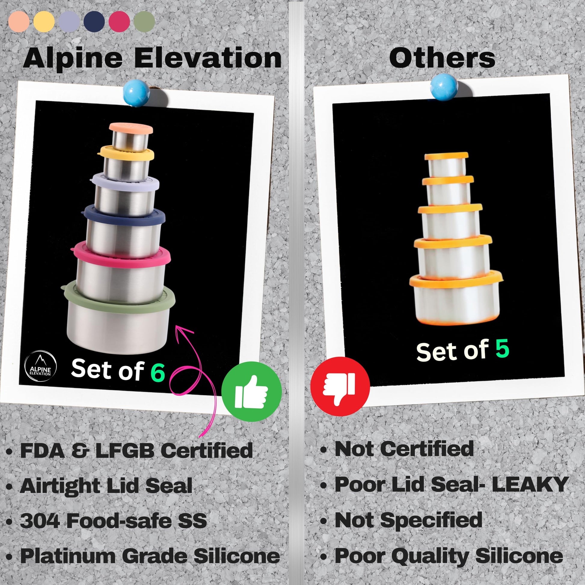 Alpine Elevation 12 Pcs - 6 Stainless Steel Containers + 6 Silicone Lids | 304 Stainless Steel Snack Container | Nesting Snack and Dip Containers | Metal Food Storage