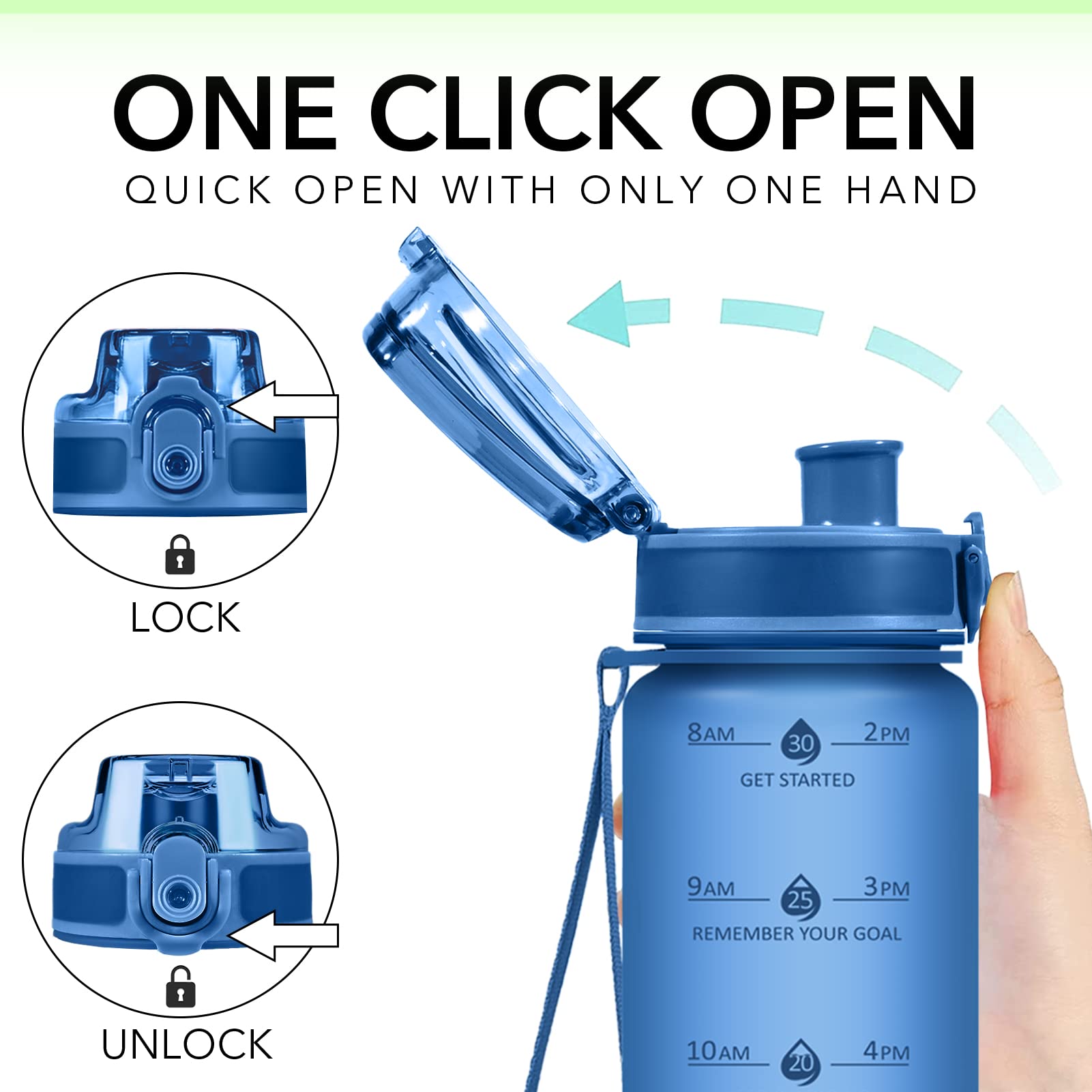 • Motivational Time Marker: Stay on track with your hydration goals by following the time markers on the bottle, which remind you to drink water throughout the day.