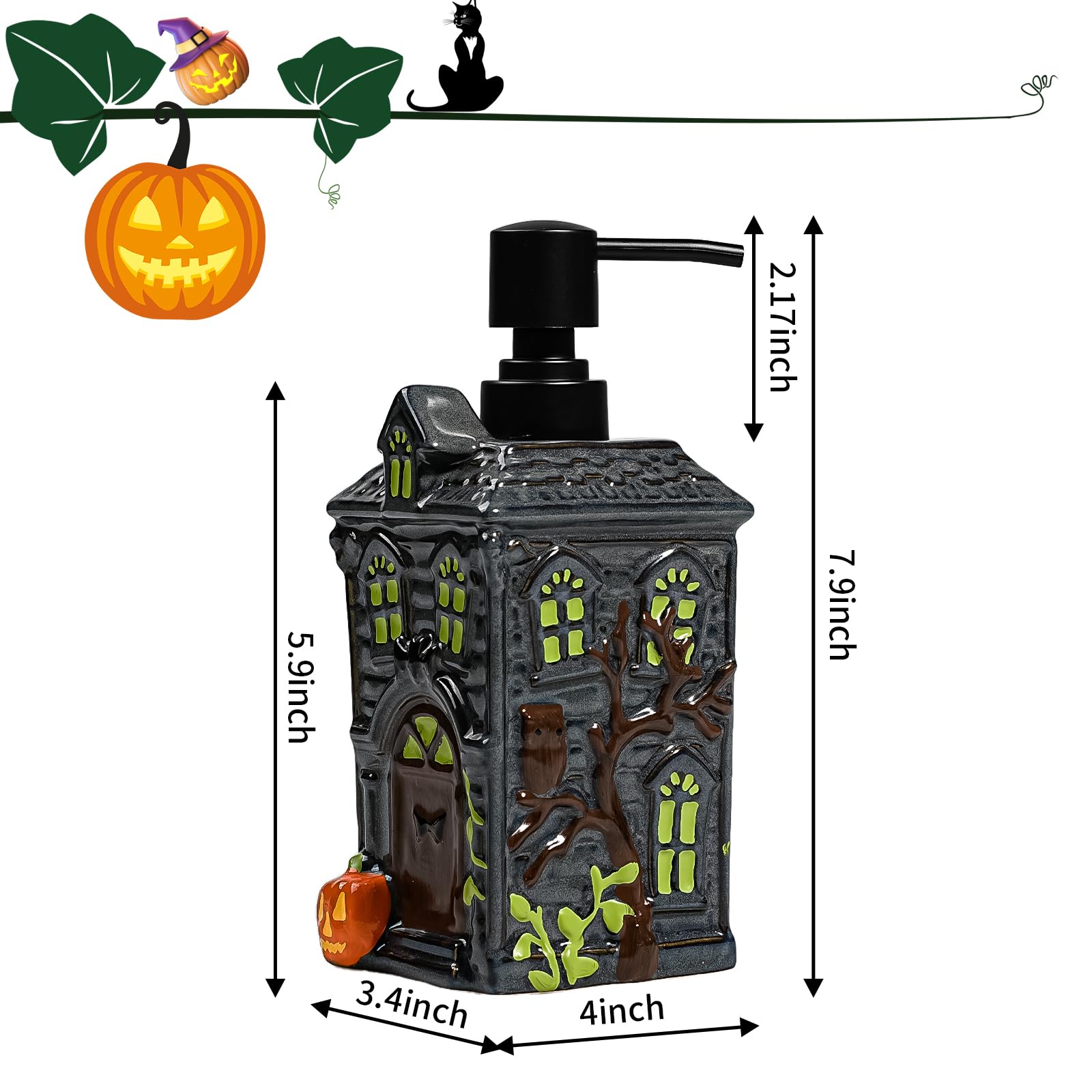 • 【Dimensions】Halloween House lotion dispenser measuring 3.4''x4'x7.9' and capacity is 19 Ounces of liquid. Haunted house soap dispensers are perfectly sized for most sinks and vanities.