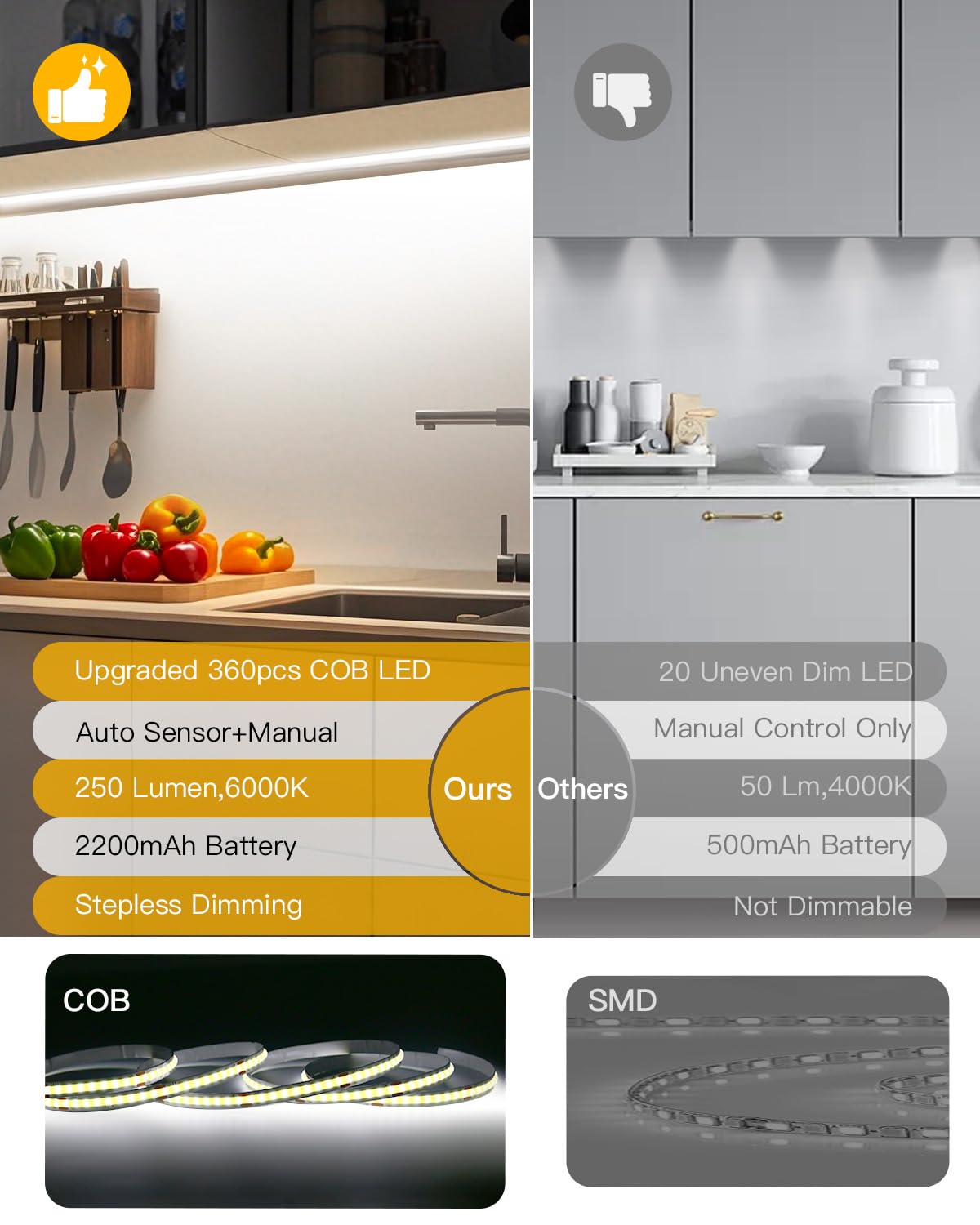 Amagle Under Cabinet Lights, 60 Leds Dimmable Motion Sensor Light Indoor, 2200mAh Rechargeable Battery Closet Lights, 6000K White COB Led Strip Lights for Bedroom, Kitchen, Stair, Shelf, 2 Pack,6.56FT