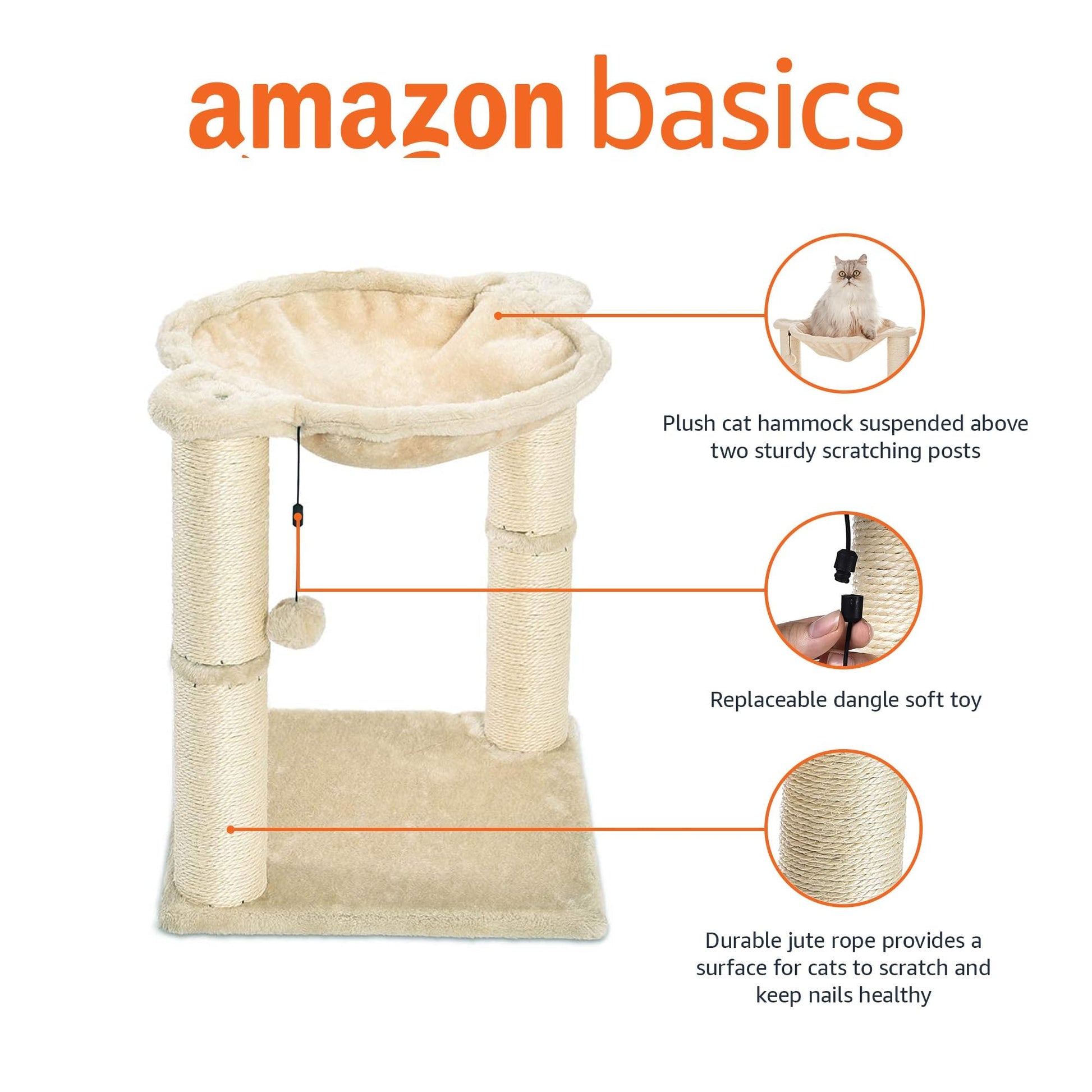 Amazon Basics Cat Condo Tower with Hammock Bed and Scratching Post,Easy to Assemble,Plush Hammock,Interactive Hanging Ball,Durable Sisal Scratch Posts for Indoor Cats, 15.8 x 15.8 x 19.7 Inches, Beige