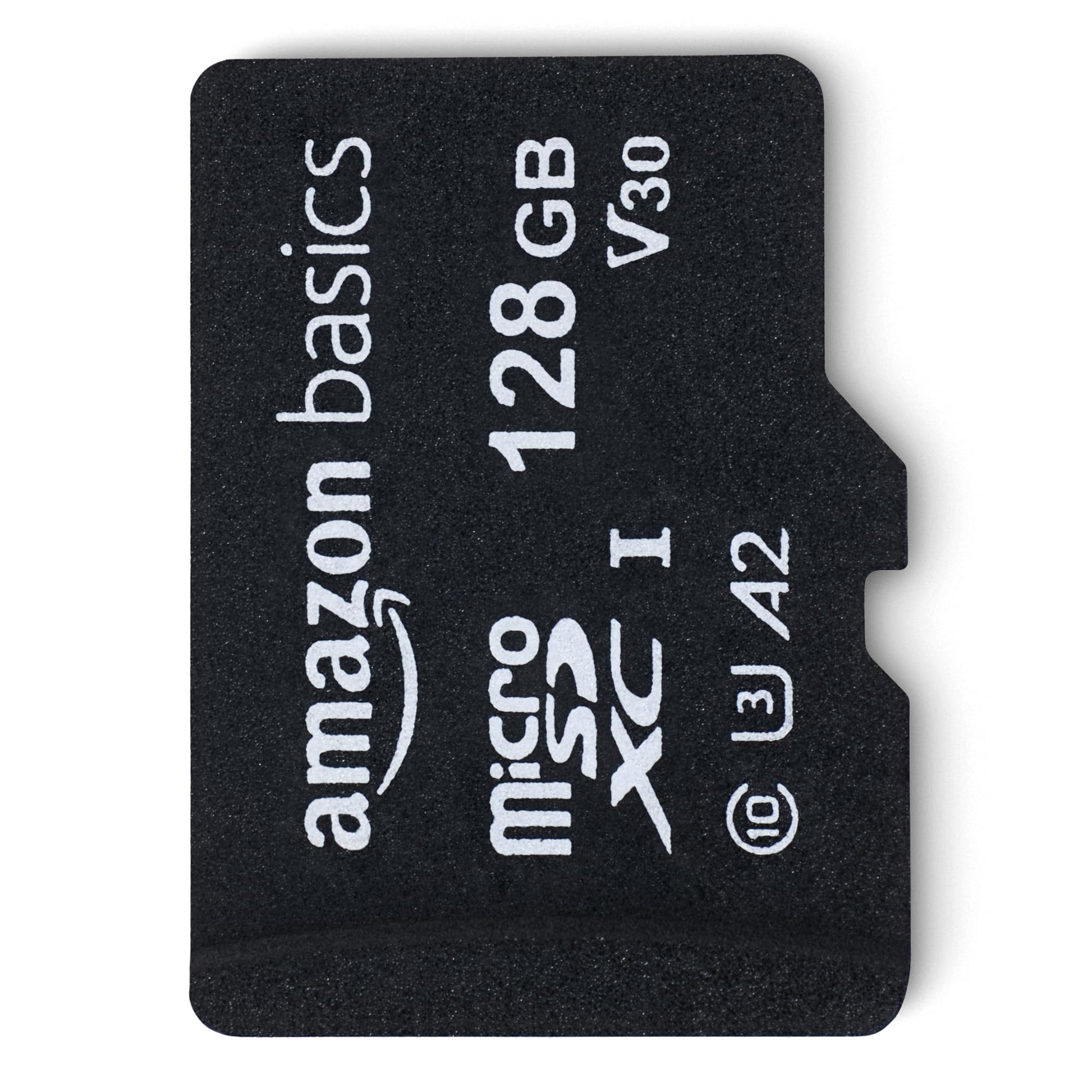 Amazon Basics Micro SDXC Memory Card with Full Size Adapter, A2, U3, Read Speed up to 100 MB/s, 128 GB, Black