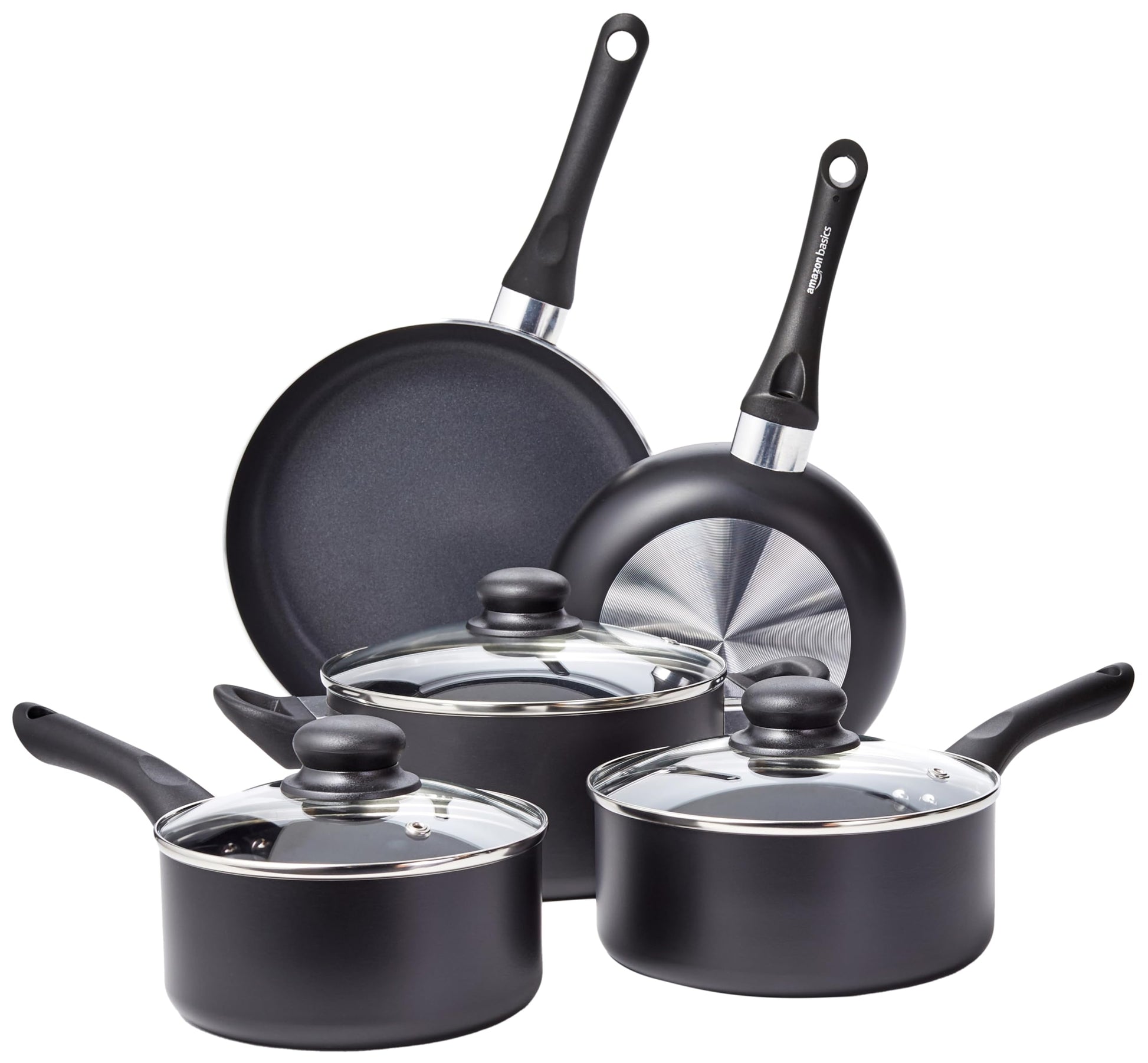 Amazon Basics Non Stick Kitchen Cookware 8-Piece Set, Non-Induction, Includes Pots and Pans, Black