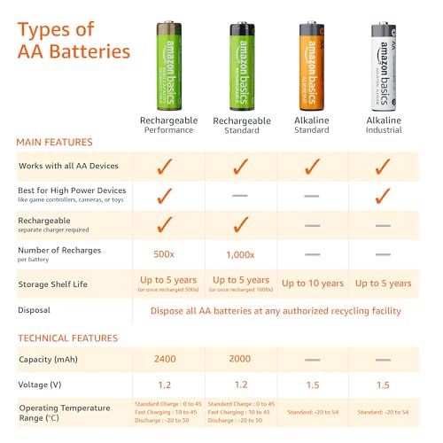 Amazon Basics Rechargeable AA Batteries, 8-Count, 2000 mAh, NiMH, Recharge up to 1000x Times, Pre-Charged