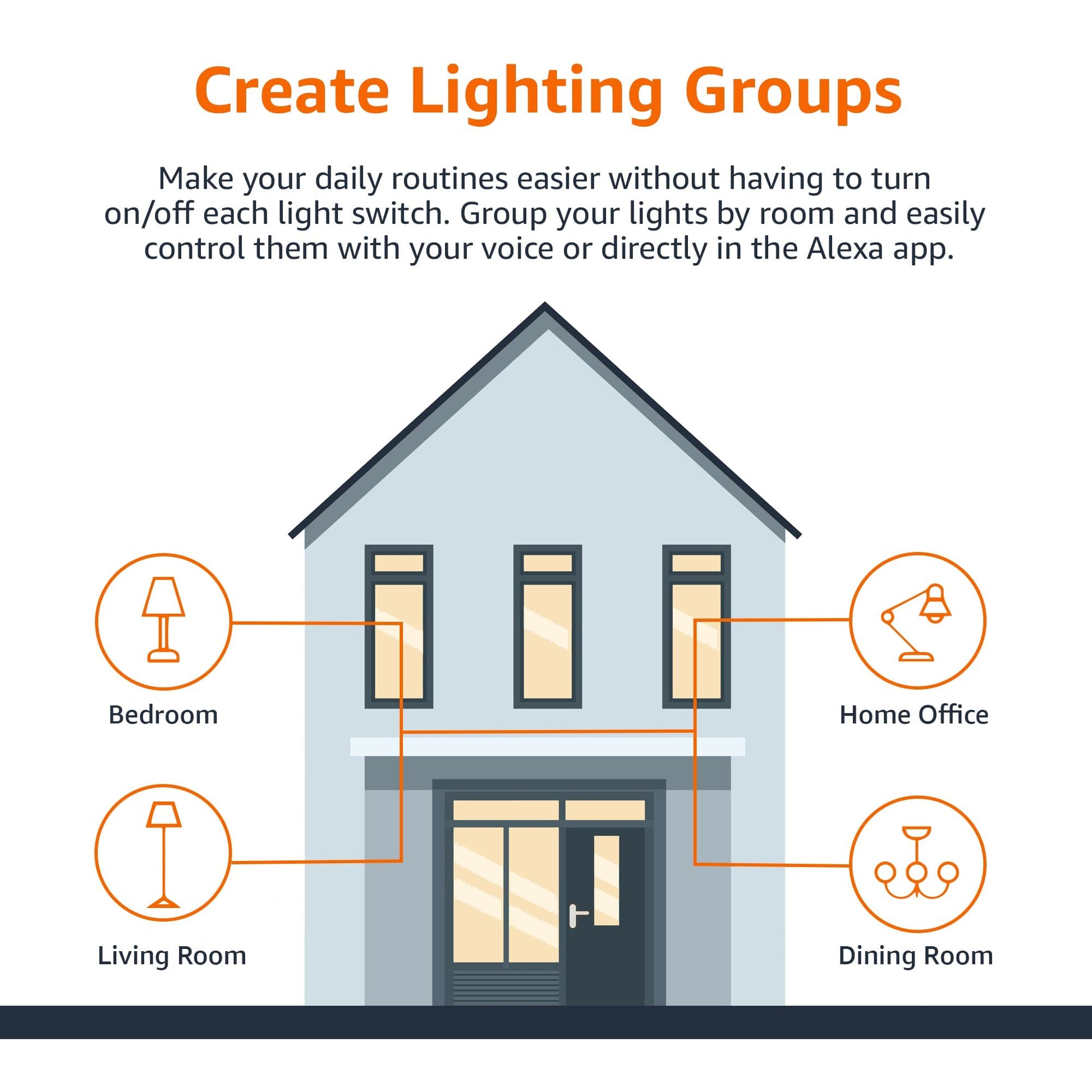 GROUP CONTROL: Create groups in the Alexa app to combine lights together, allowing you to control lights by each room, or all of your home lights with a single voice command or via app. When it's time to sleep, just say “Alexa, turn off the bedroom” OR use the Alexa app to turn off the bedroom lights at once.