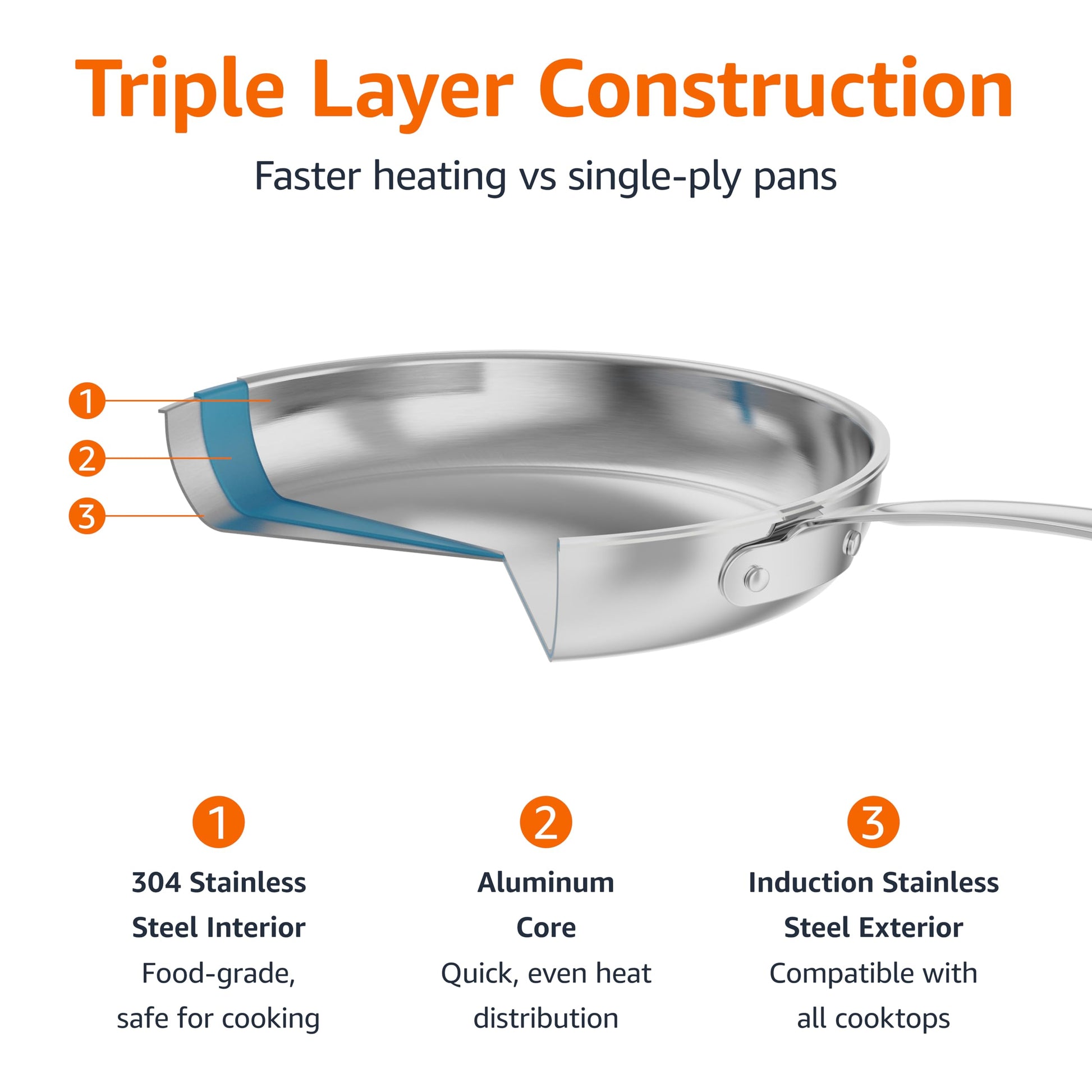 Amazon Basics Tri-Ply Stainless Steel Fry Pan, 12 inch, Silver (Previously AmazonCommercial brand)