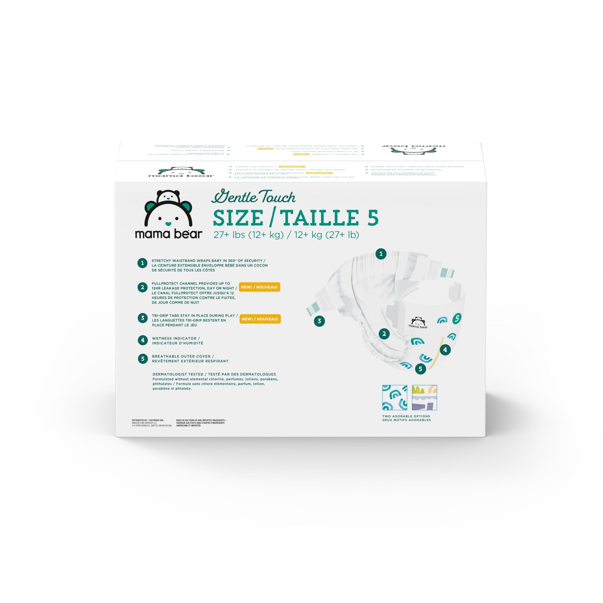 • IN THE BOX: Mama Bear Gentle Touch Diapers for babies 27+ pounds; size 5; (4 packs of 33 diapers each, 132 total)