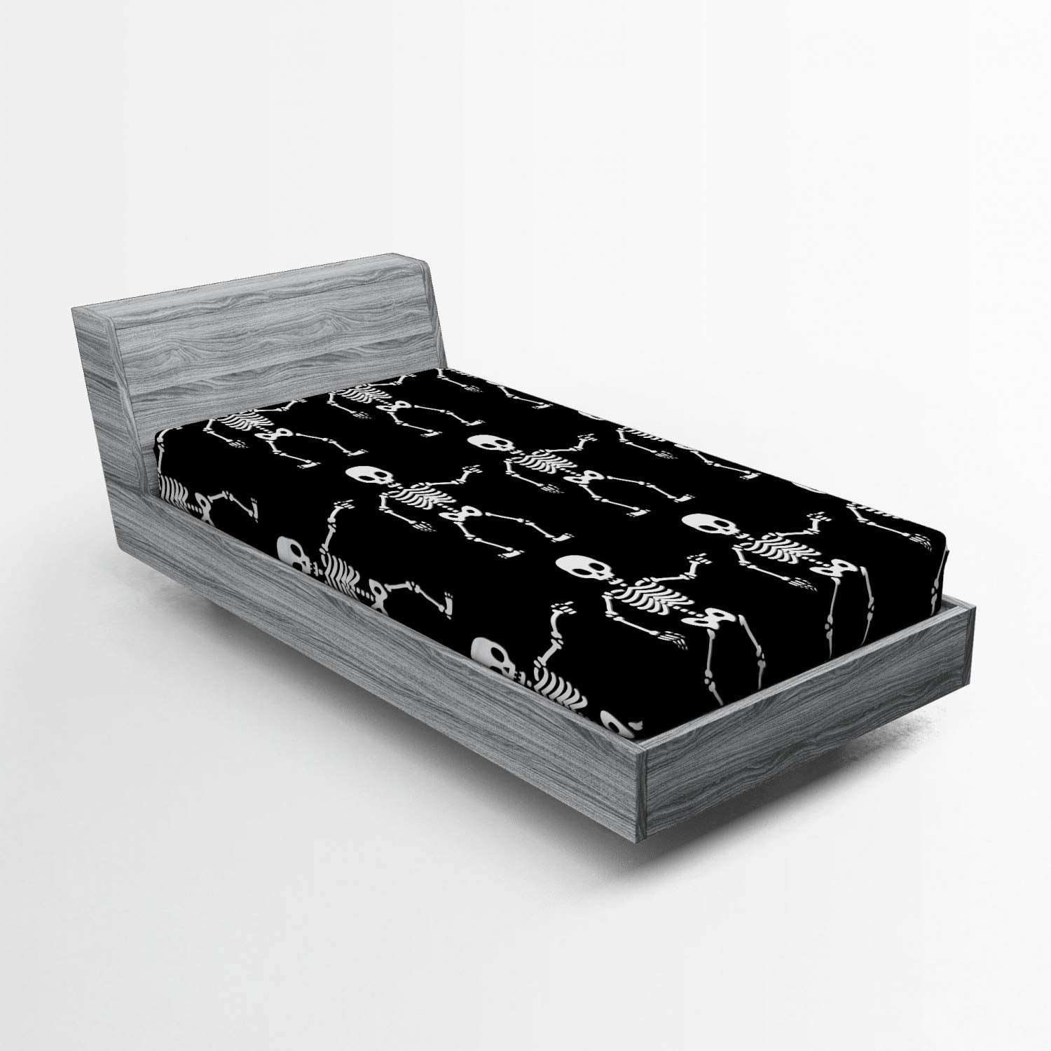 Ambesonne Skeleton Fitted Sheet, Simple Monochrome Pattern of Pointing Funny Spooky Halloween, Bed Cover with All-Round Elastic Deep Pocket for Comfort, Twin Size, Charcoal Grey and White