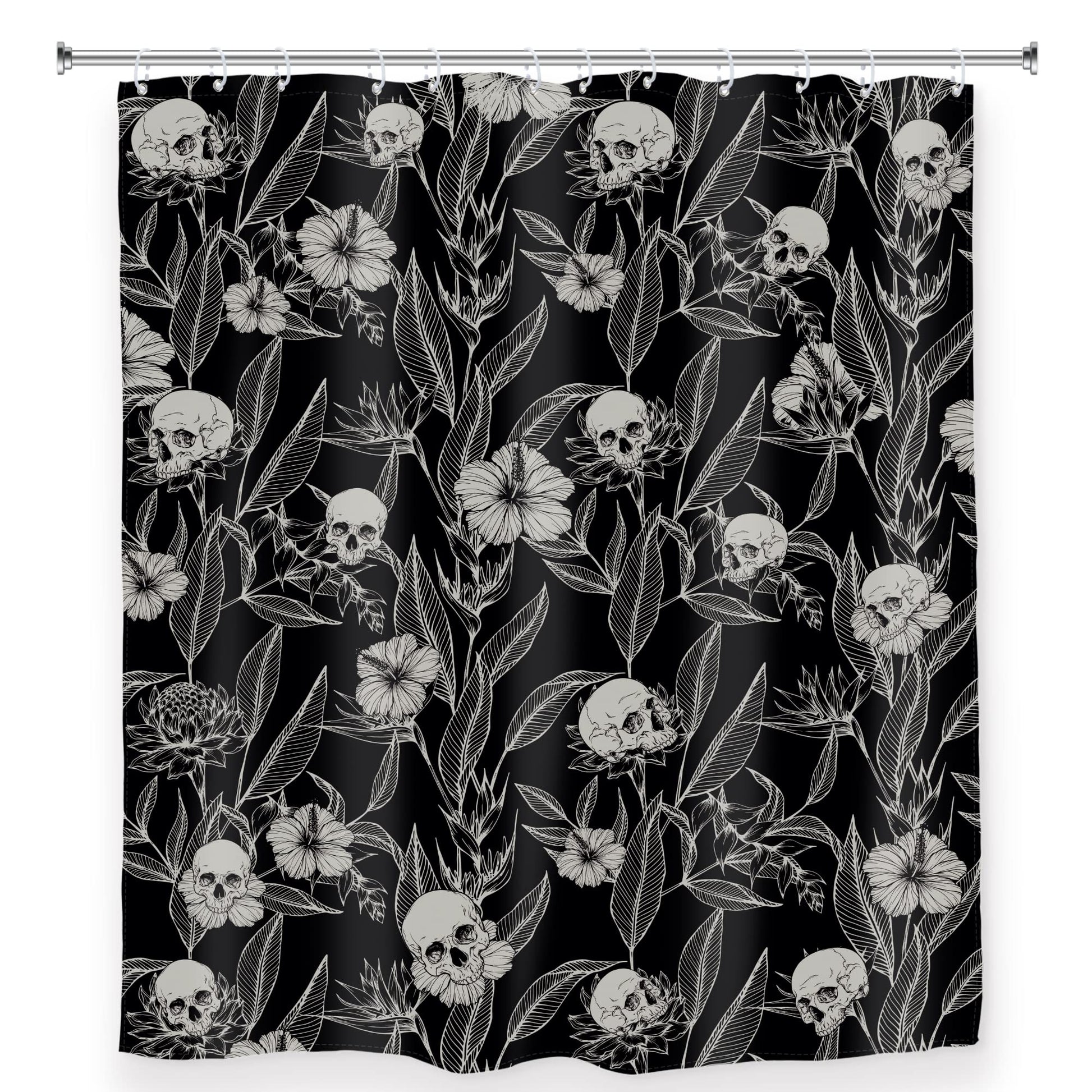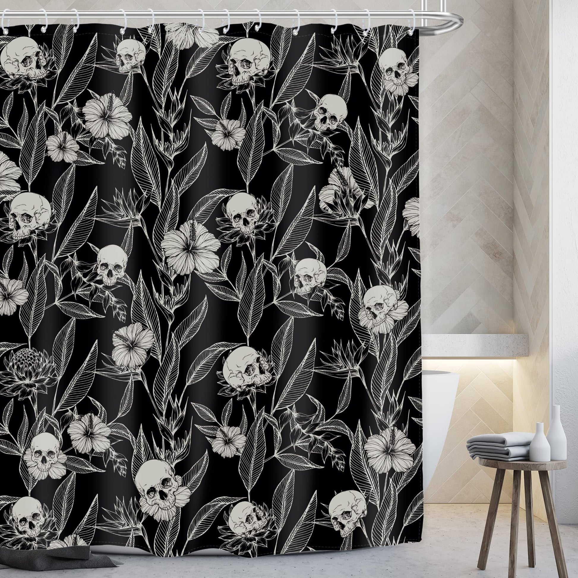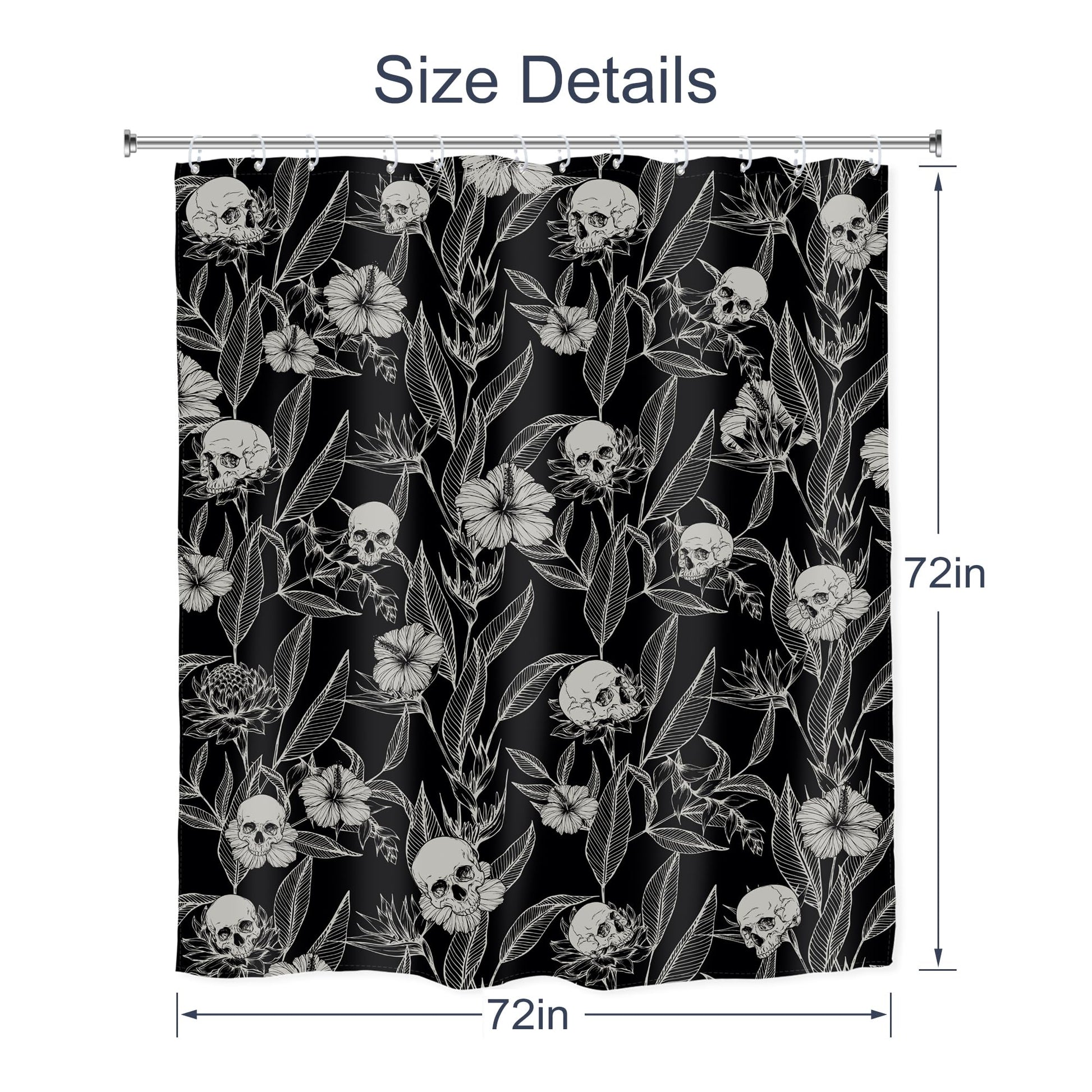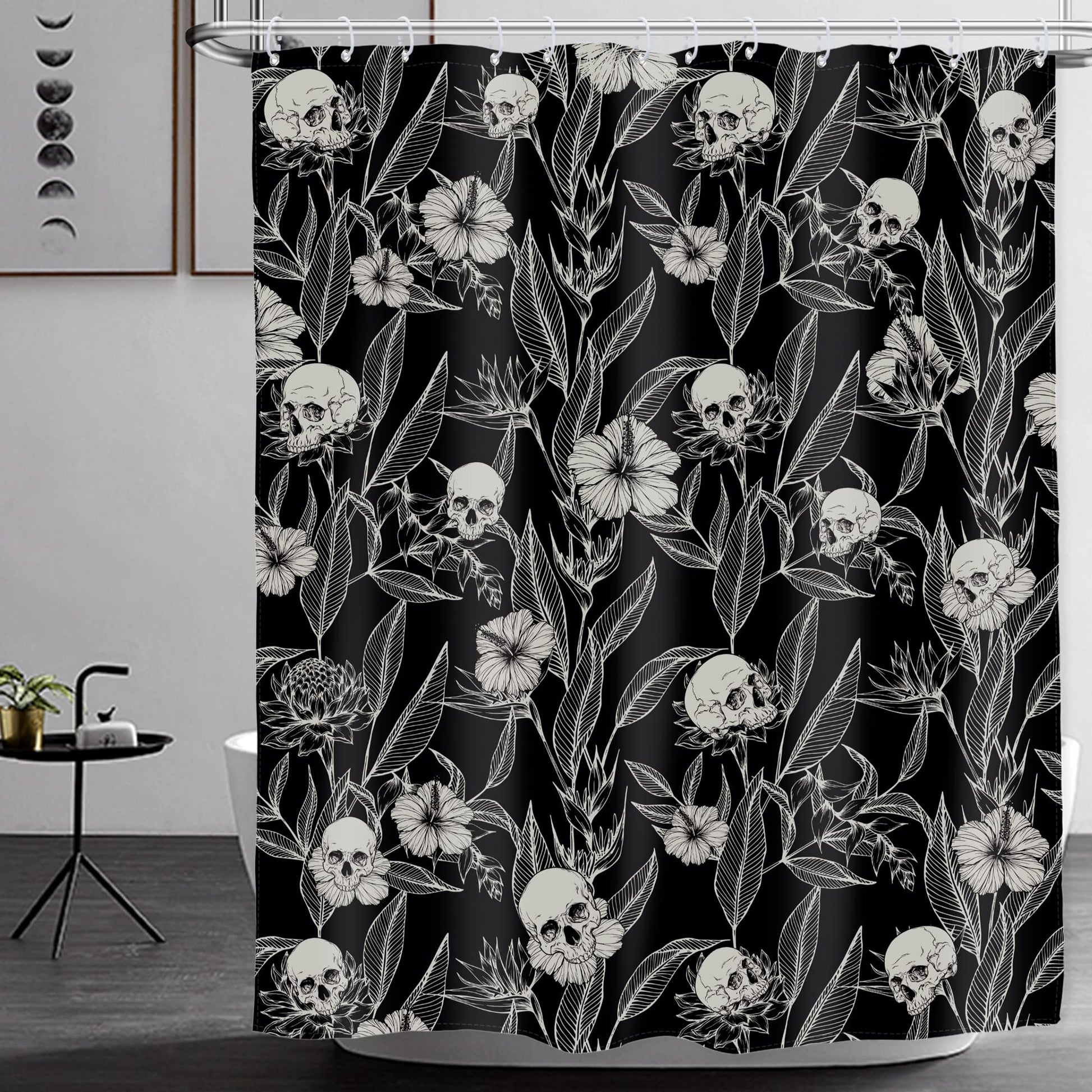 AMBZEK Black Skull Floral Shower Curtain 72Wx72L Inch Men Gothic Spooky Skeleton Goth Flower Leaves Halloween Cool Artwork Cloth Fabric Waterproof Polyester Bathroom Decor Set with 12 Pack Hooks