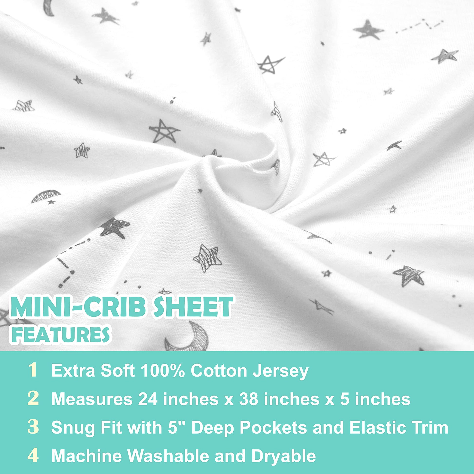 • Perfect Fit & Secure Coverage: Made from 100% Cotton Jersey and measuring 24” x 38” with a depth of 5 inches, our mini crib sheets snugly fit most standard pack and play mattresses and mini crib mattresses
