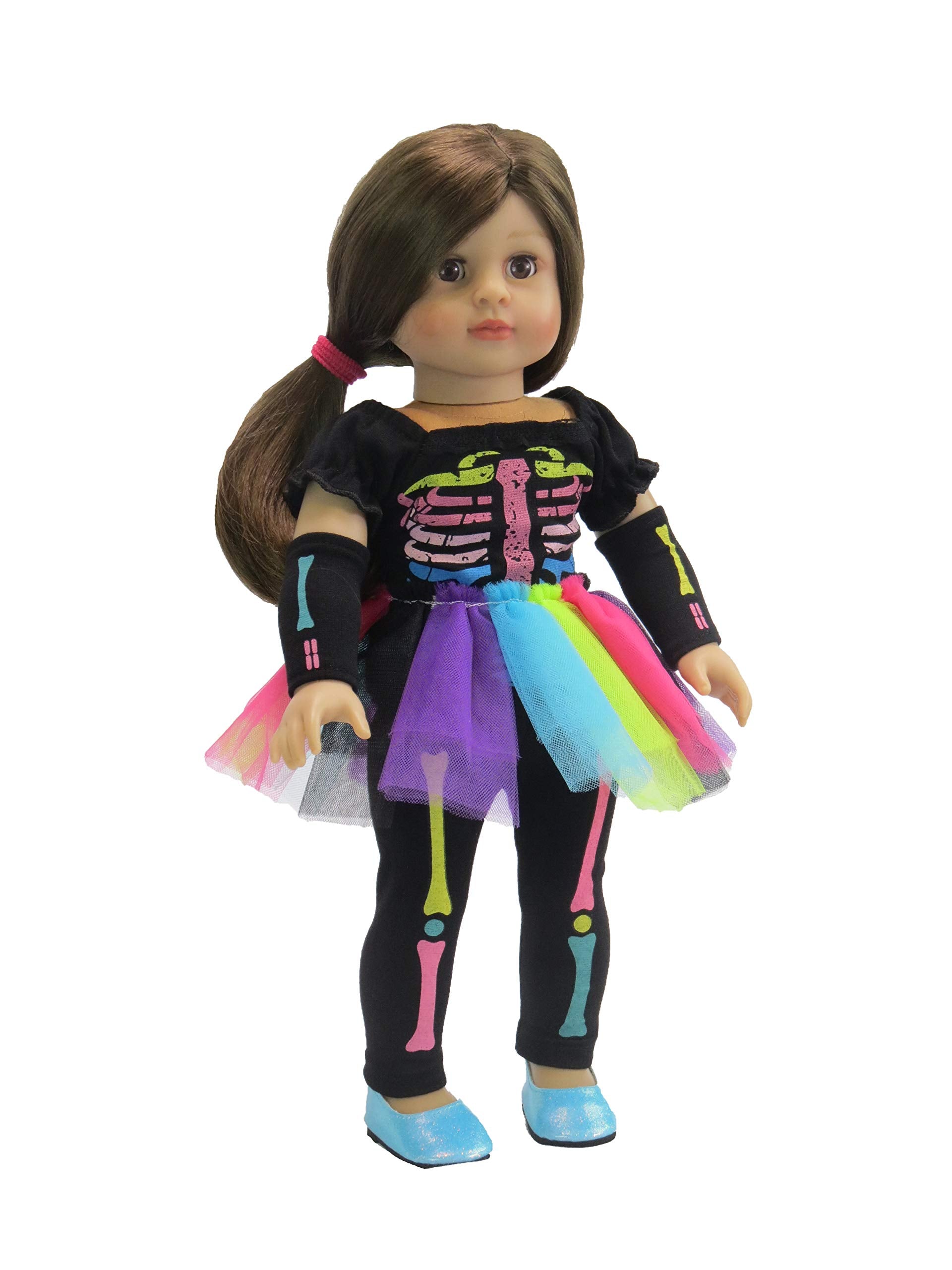 PREMIUM QUALITY MATERIAL: Our Electric Neon Skeleton Halloween Costume for 18-inch dolls is crafted with the finest materials, ensuring durability and a realistic appearance. Your doll will look stylish and trendy in this high-quality accessory. Our clothing has beautiful fabrics with soft velcro closures.
