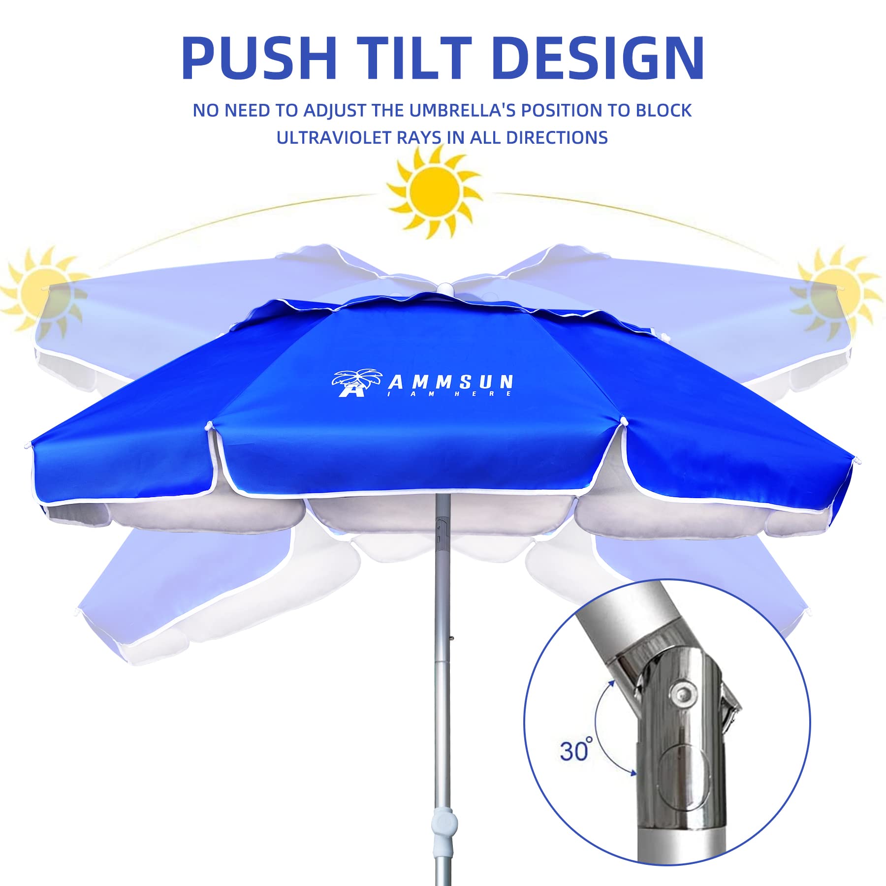 • PUSH BUTTON TILT & AIR VENT DESIGN: AMMSUN portable travel beach umbrella features a two-way tilting mechanism that allows you to adjust the shade and block the sun quickly without moving the umbrella, you can enjoy cool shade from sunrise to sunset