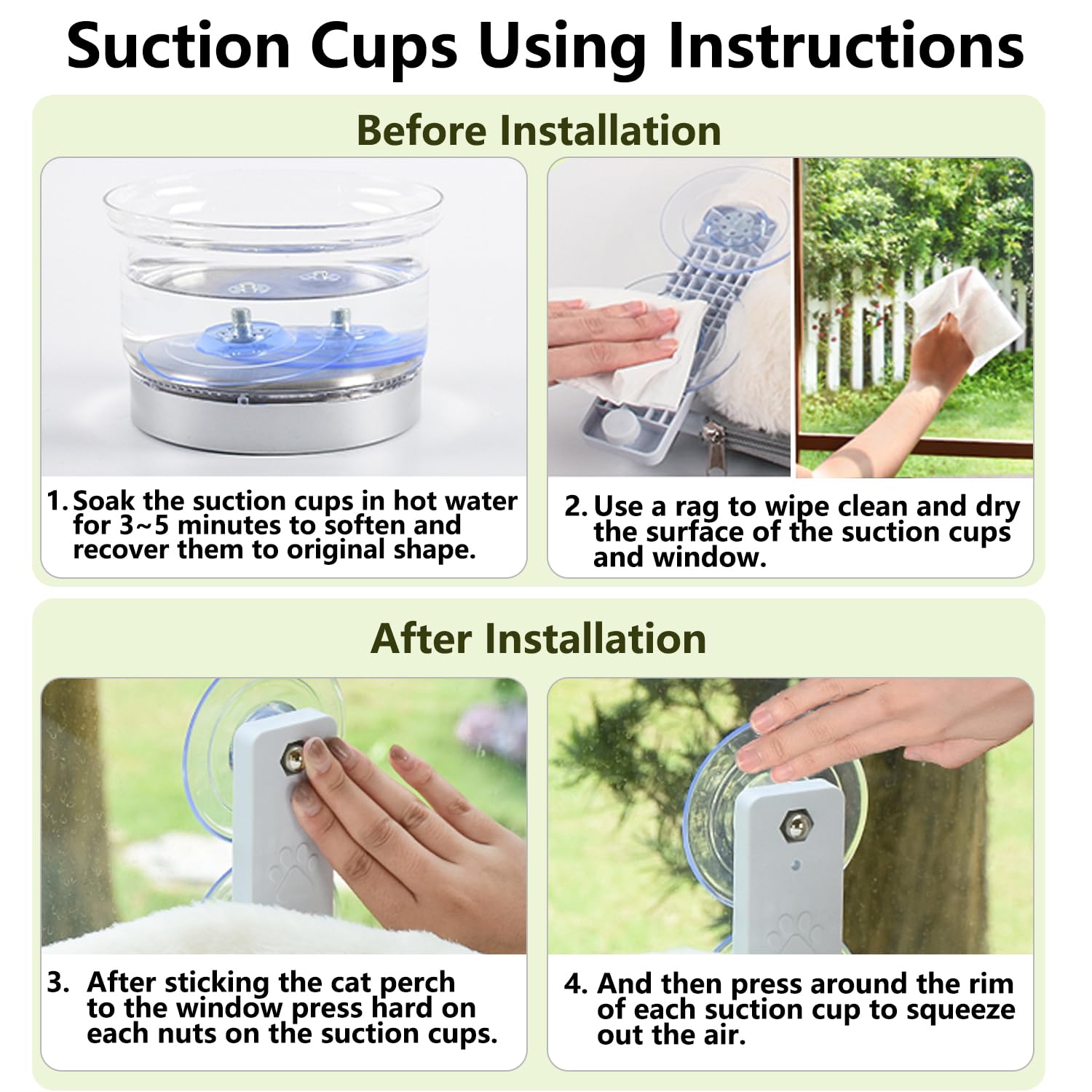 • 360° Window Perch: Cats love warmth, it is ideal for them to bask under the sun, enjoying sunbathing. They can also enjoy climbing up to the hammock and down, getting a 360° full view of the surroundings. On a sunny afternoon, enjoy languid hours with the dozing cats.