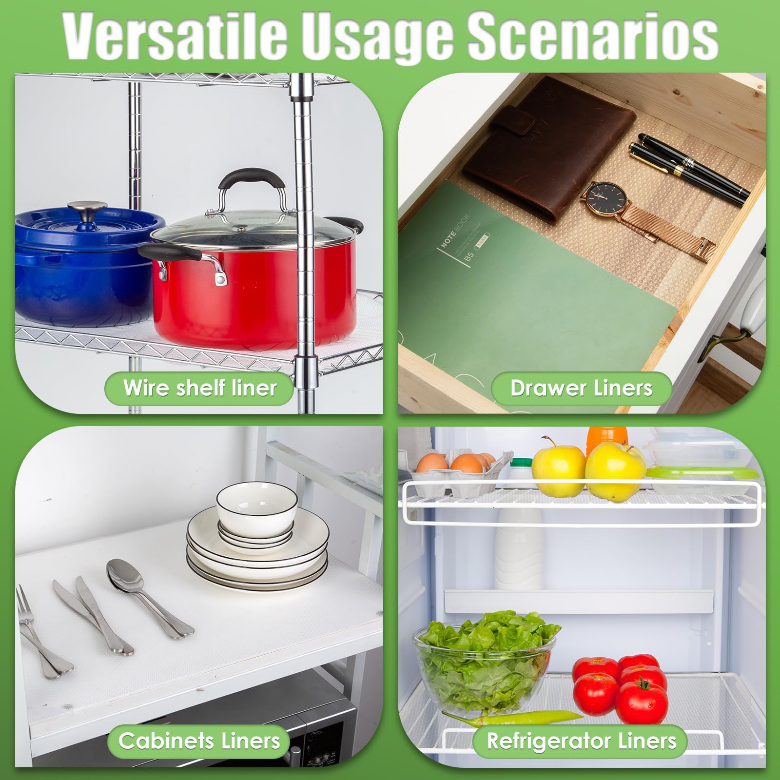 • MULTI USE LINER:Non adhesive shelf liner is great for refrigerator mats to keep the fresh of food and fruits.also can be kitchen cabinet liner,drawer liner,wire shelf liner,cupboard liner,shoe shelf liner,glass shelves liner etc. It’s perfect decor for your home and protect furniture from other daily wear and tear.