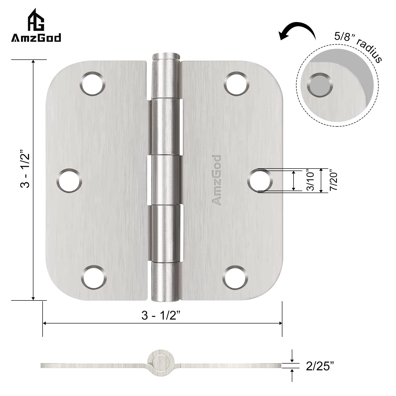 AmzGod Door Hinges Brushed Nickel - 3 Pack Satin Nickel 3.5 Inch Rounded Interior Door Hinges with 5/8" Radius - Flat Iron Residential Standard 3 1/2 Inches Silver Door Hardware