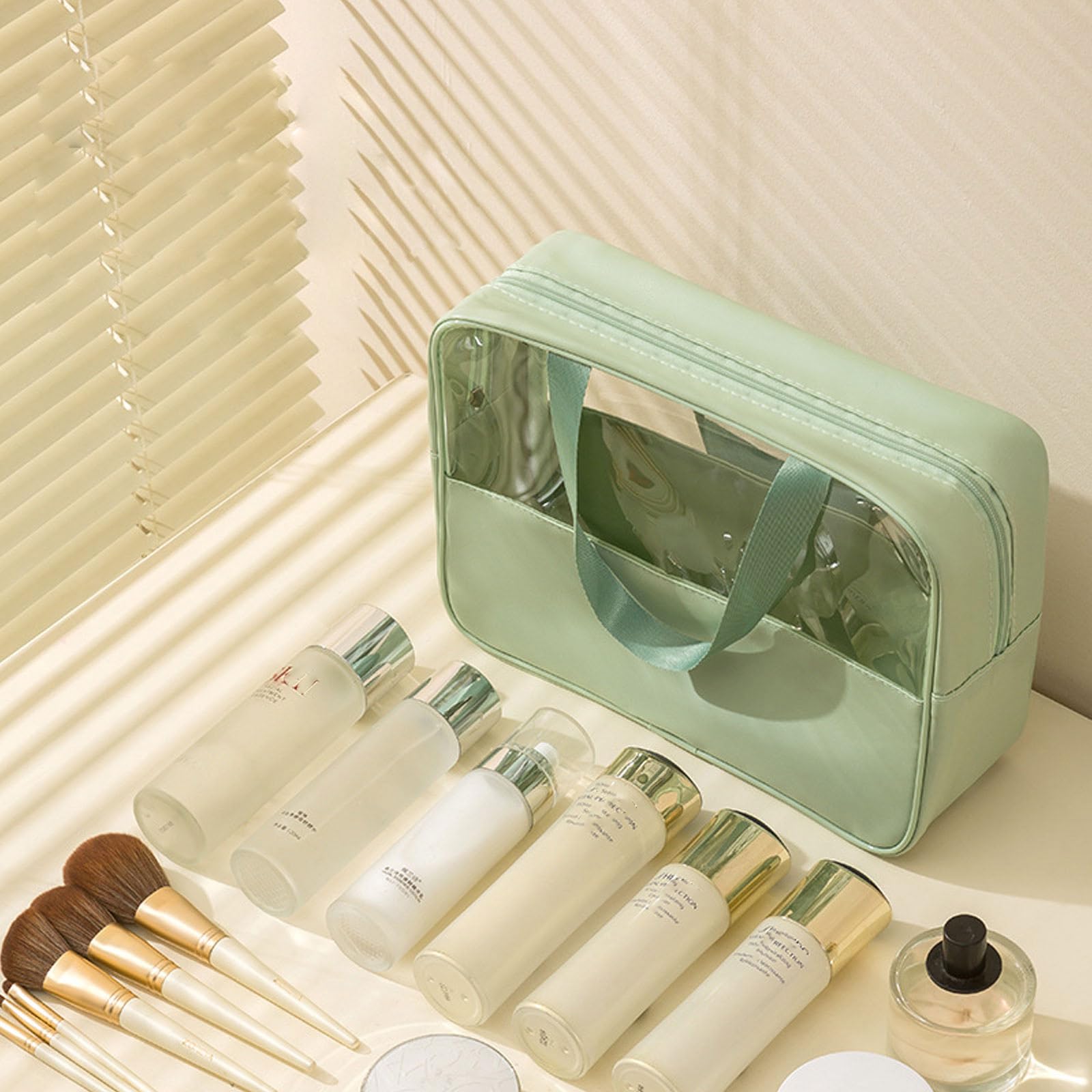 • Travel Toiletry Bag: durable Clear PVC material + PU Leather material, water resistant, sturdy quality, lightweight for daily necessities, with top handle easy to carry with