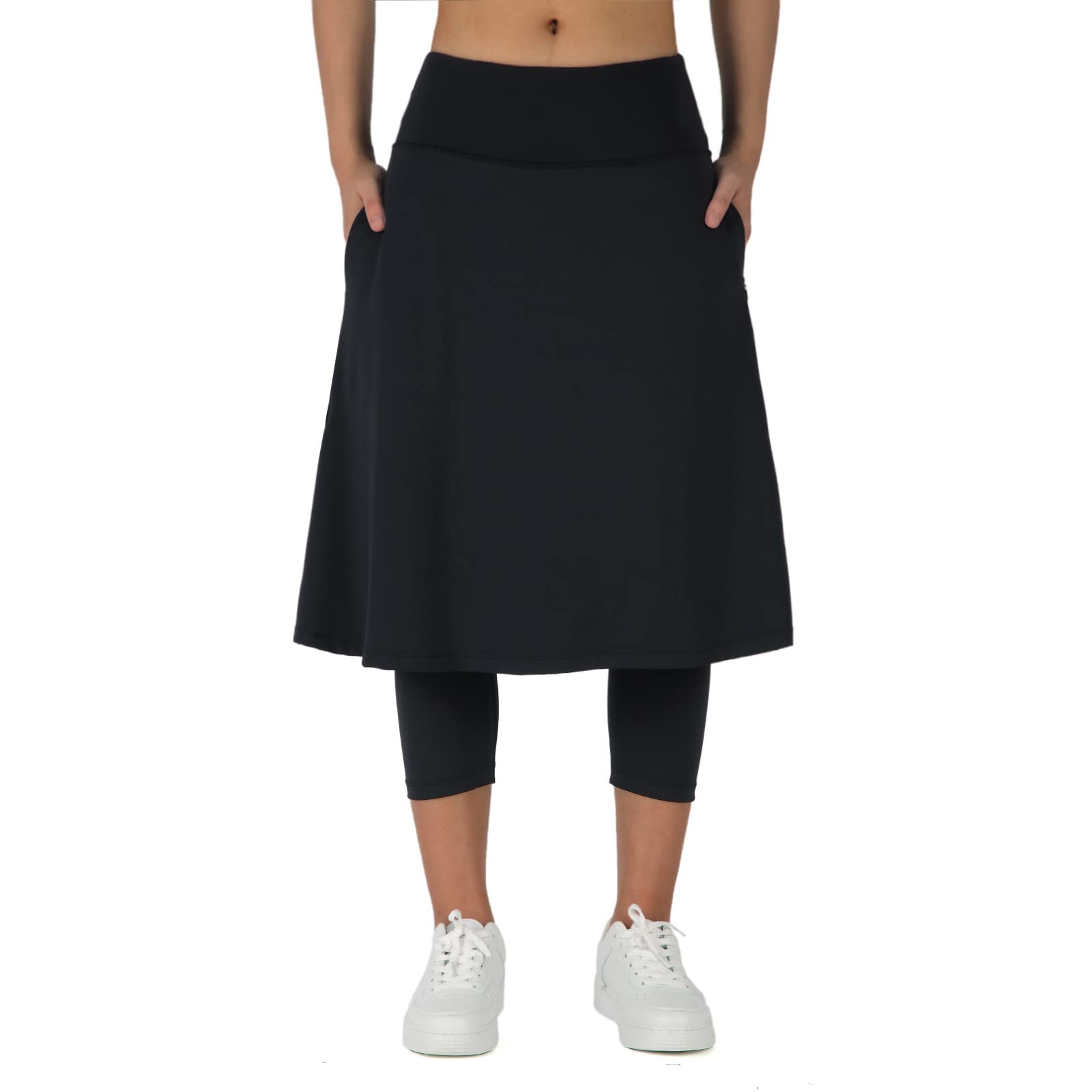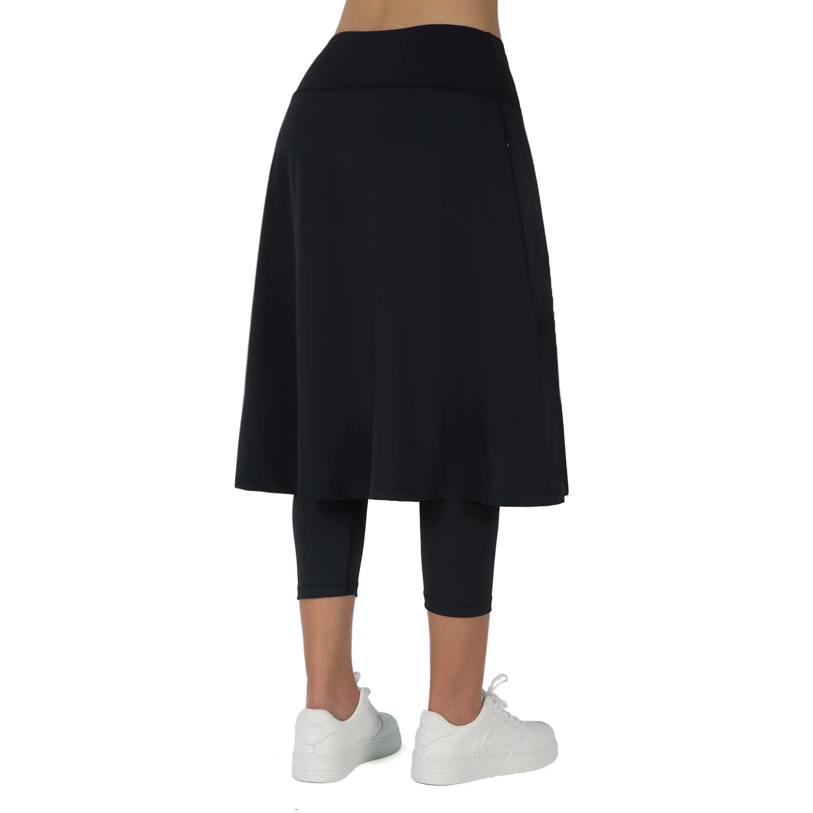 ANIVIVO Women Long Knee Length Skirt with Capris Leggings,Skirted Leggings with High Waisted Zipper Pockets(Black,L)