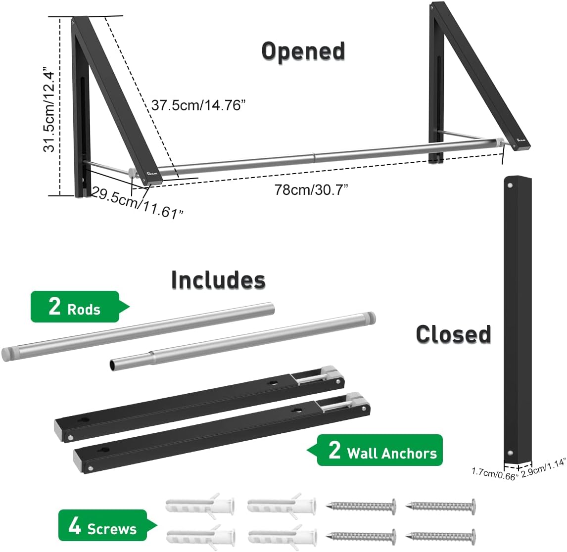 • This wall hanger is made of high quality aluminum, non-corrodable, a good small item lightweight but sturdy and durable. Open size: approx. 32 x 29 x 3 cm (L x W x H); Closed size: approx. 37.3 x 3 x 1.8 cm (L x W x H). Shaft length: 82 cm