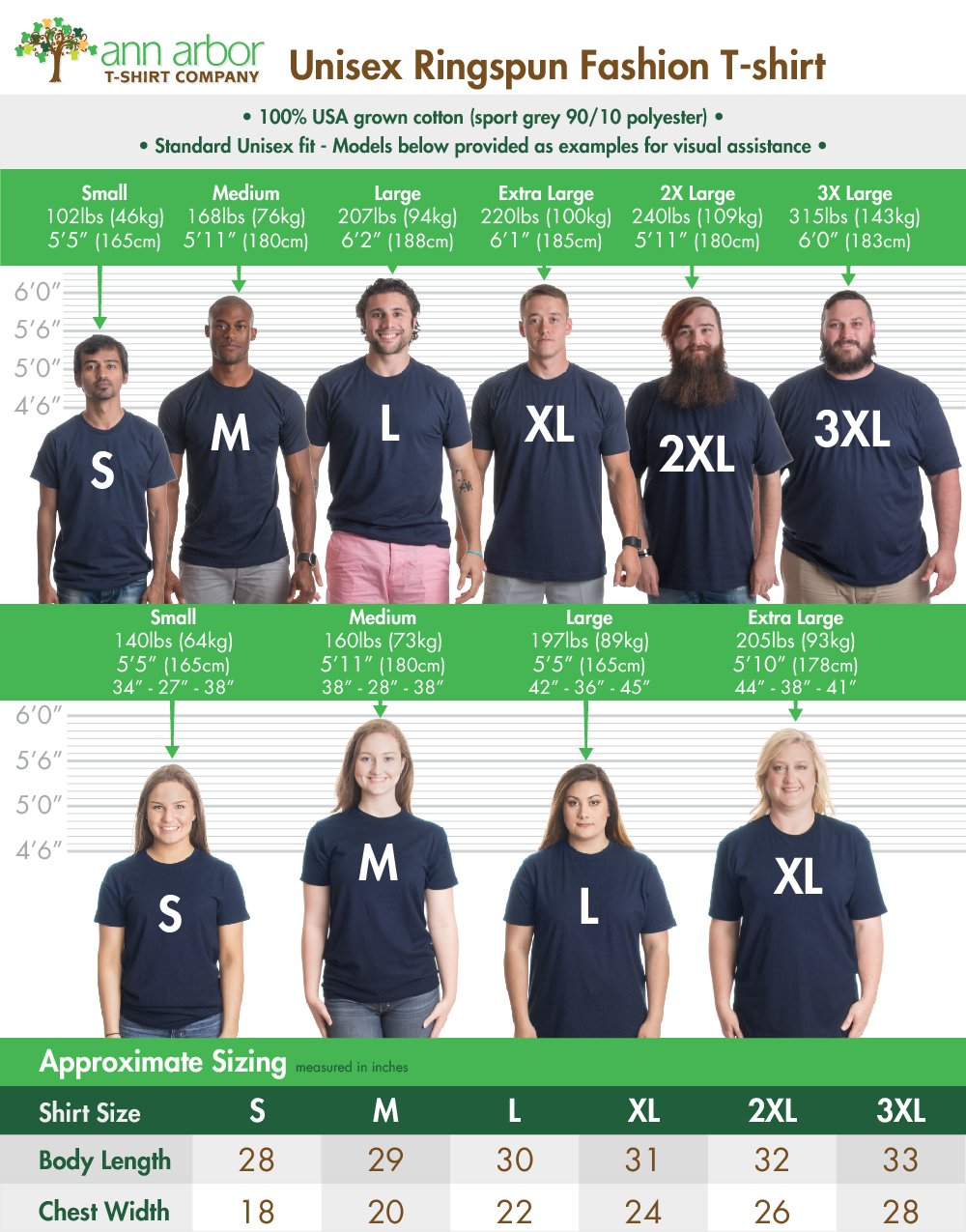 • UNISEX MODERN FIT SIZING | this shirt is slightly tapered to be a little less boxy than the old style of mass-market t-shirt. Nothing drastic, and most people wear the same size in our shirts as they do in all of their others, but you might go one size larger if you're on the fence. It is pre-shrunk, but like any high-cotton product, will still shrink slightly in the wash. Our model photos are the real thing - the actual shirt on our salesguy, Rich. He's 6' 2', 200 lbs and wearing a large
