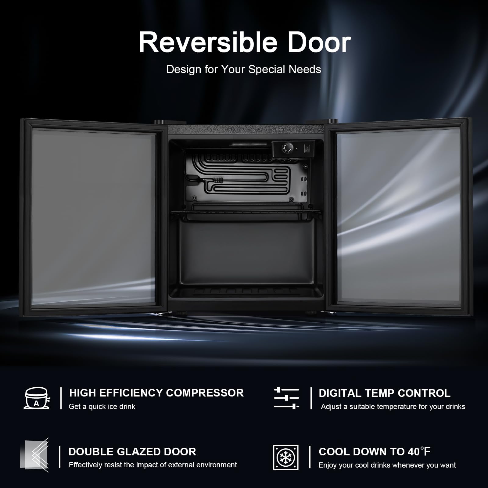 • IDEAL BEVERAGE COOLER: 16.46'D x 16.93'W x 18.5'H mini refrigerator can keep a variety of canned drinks or wine chilled without taking up too much space at your home, dorm, bar or office. It can conveniently hold 48 standard-sized drink cans . The interchangeable design of the left and right doors facilitates the selection of storage locations, adapts to the high-quality needs of different people and different locations.