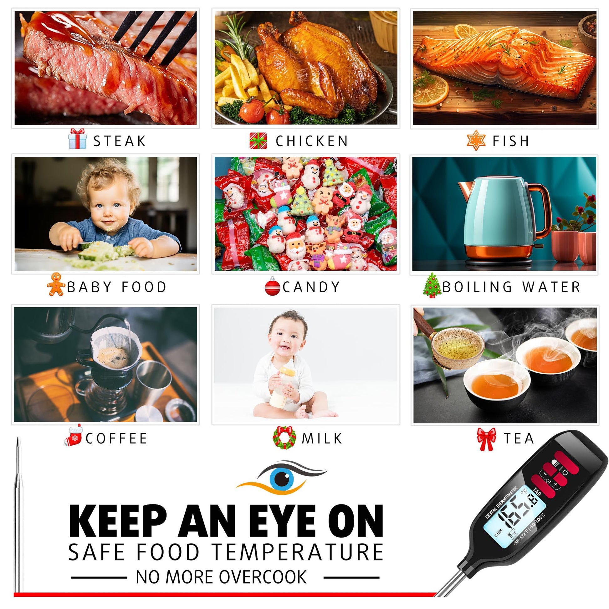 • [ Fast Respond & Accurate ] This instant read digital meat thermometer instantly check temps of steak, chicken, fish, milk, candy syrup, bread, or frying oil in 2 seconds. Never overcook meats or burn desserts again