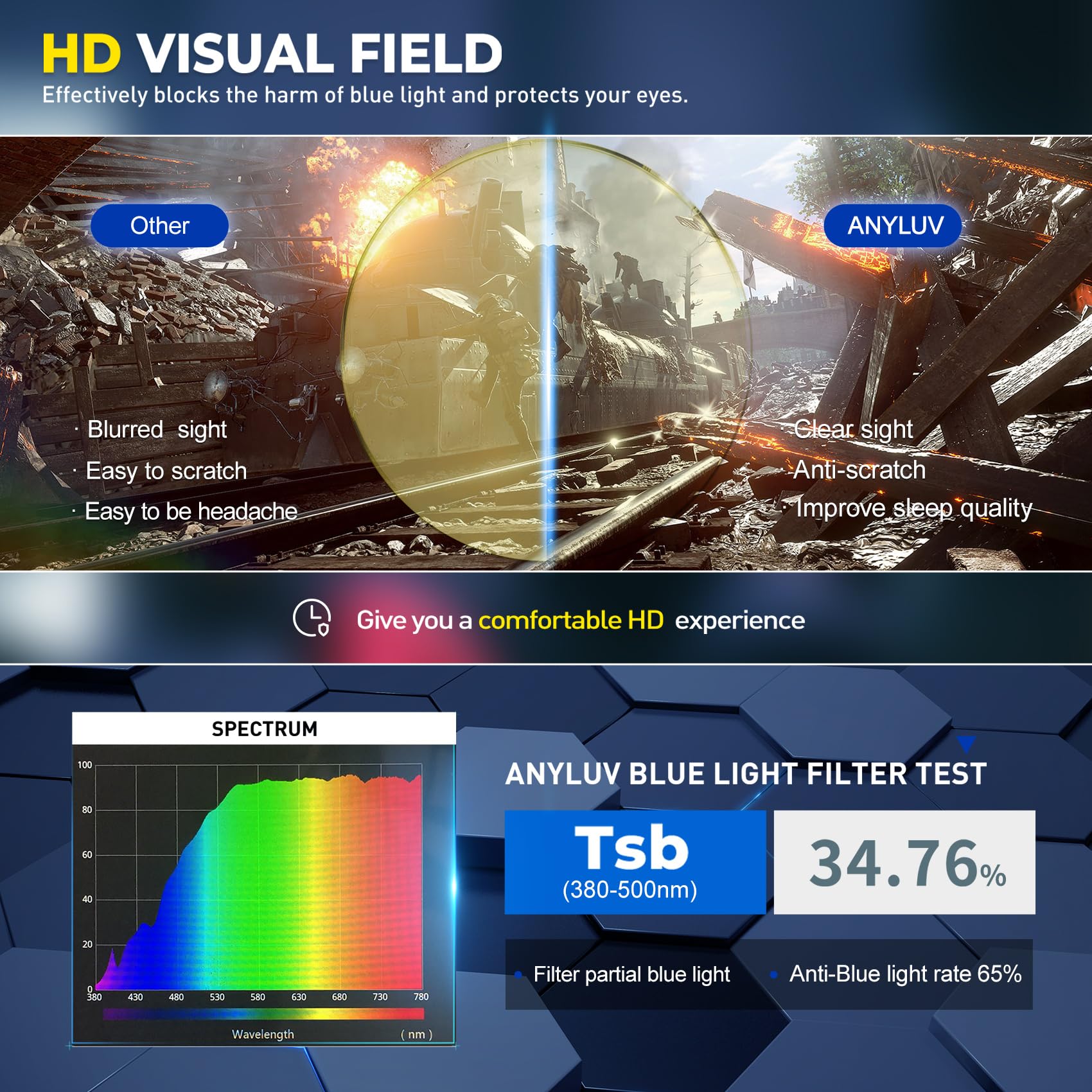 • UV400 Blue Light Protection: ANYLUV blue light glasses are specifically designed for women and men, featuring a 65% blue light blocking capability. These glasses efficiently filter harmful high-energy blue light emitted by screens, ensuring that your eyes remain comfortable without sacrificing your exposure to beneficial blue light.