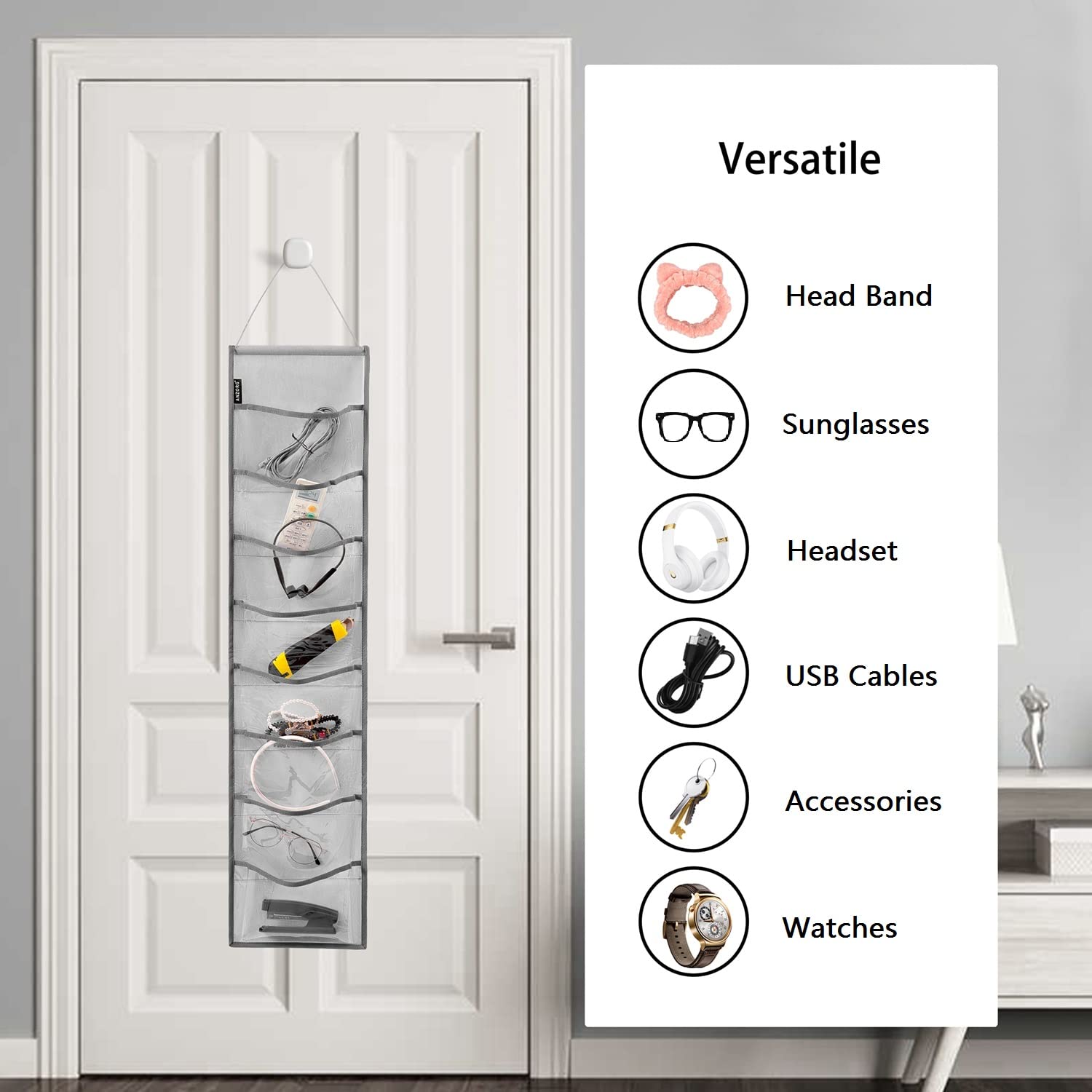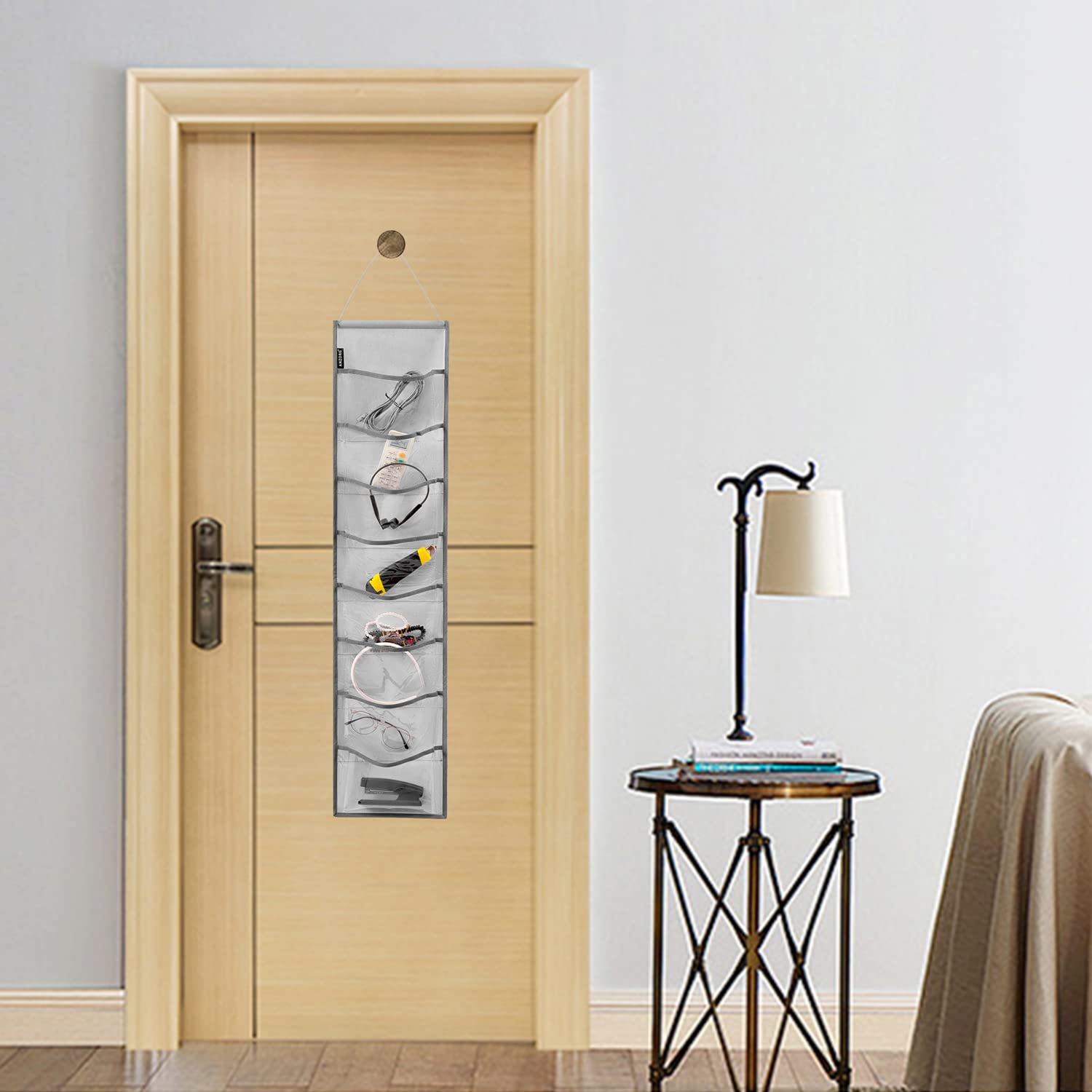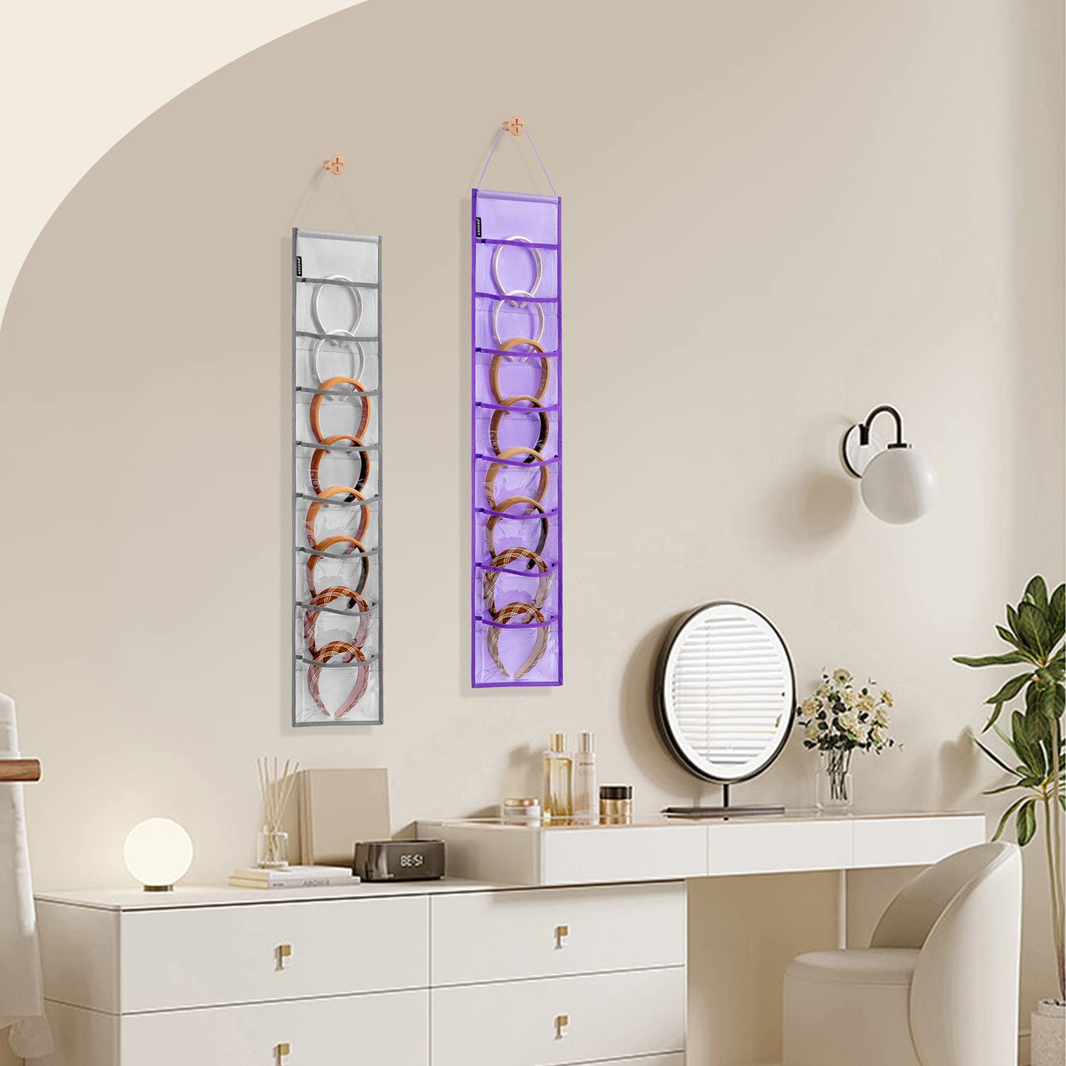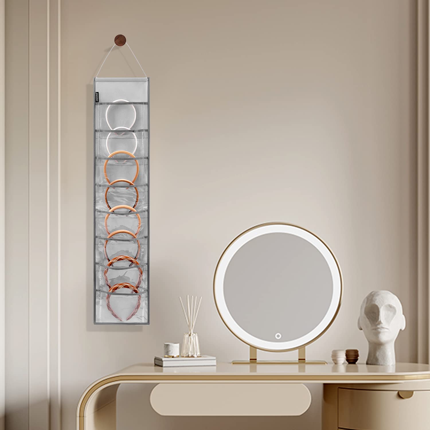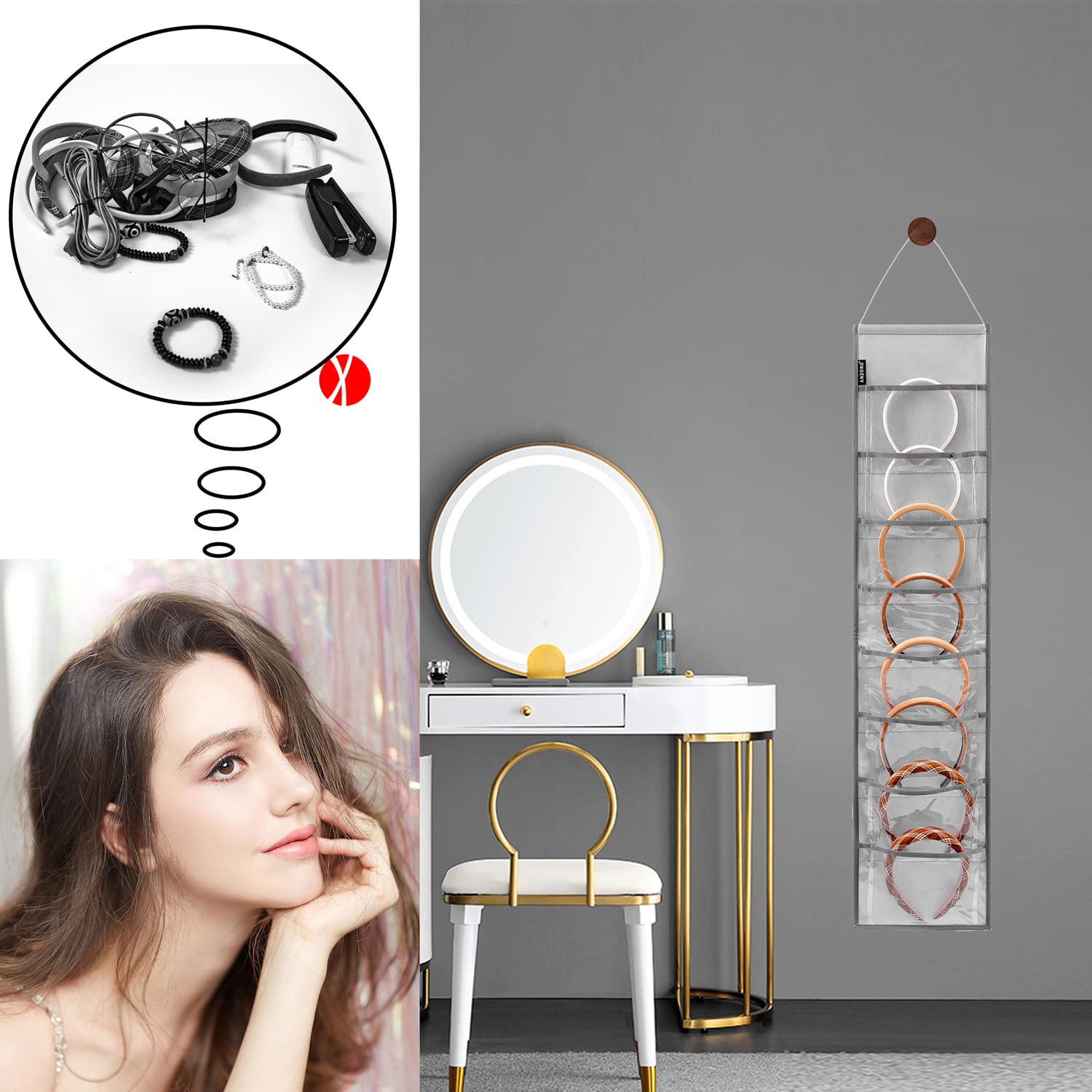 ANZORG Wall Hanging Headband Organizer Ribbon Hair Hoops Storage Hairbands Hair Accessory Holder with Clear Pockets (GREY-8 POCKETS-2 Pack)