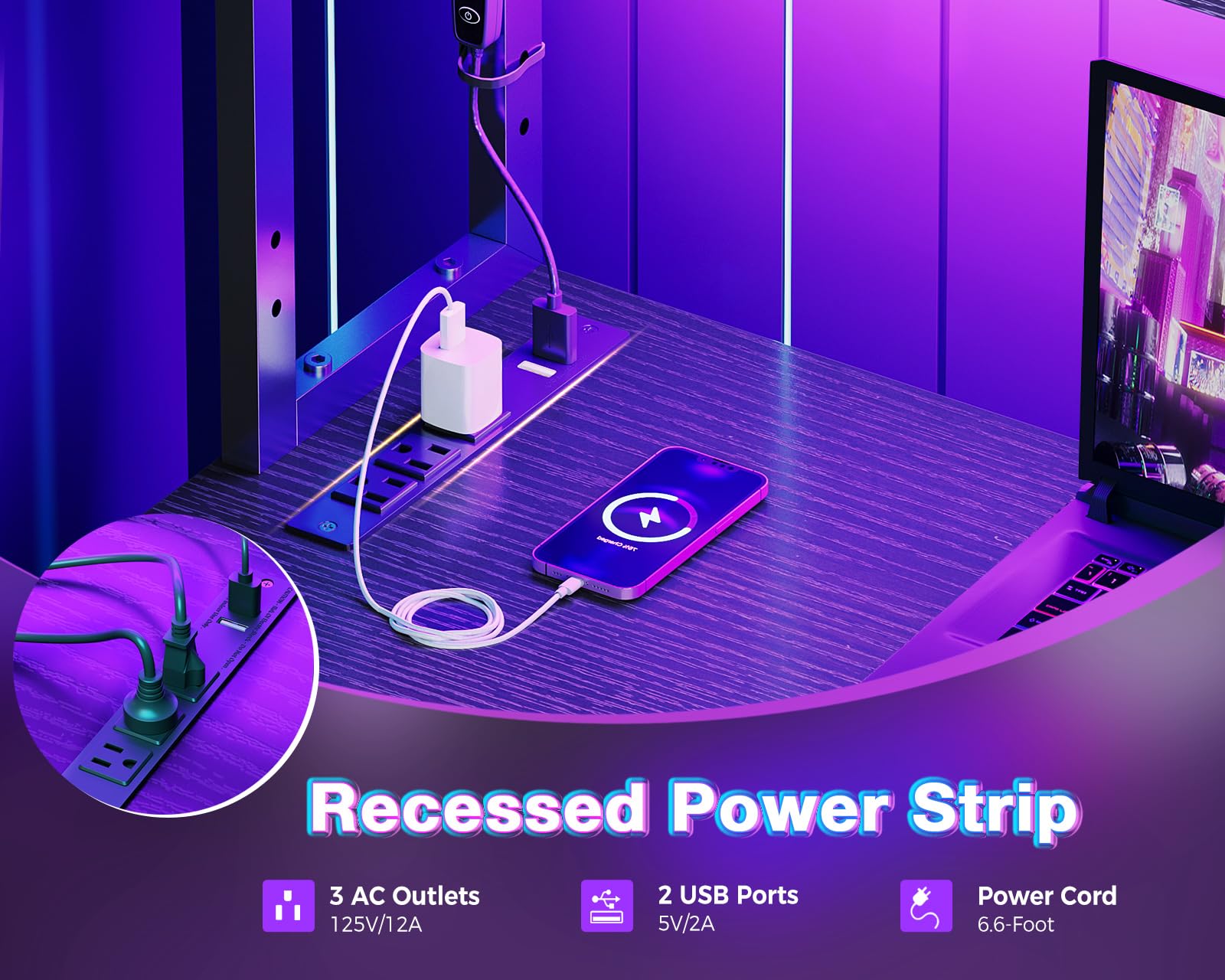 • 【Gaming Desk with Colorful LED Lights】This gaming desk features LED strip that contains 10 static colors, 8 brightness grades, 10 dynamic modes and memory function with switching controls. Adjusting to the proper lighting can reduce eye strain, improve focus, and create a comfortable workspace or gaming space.