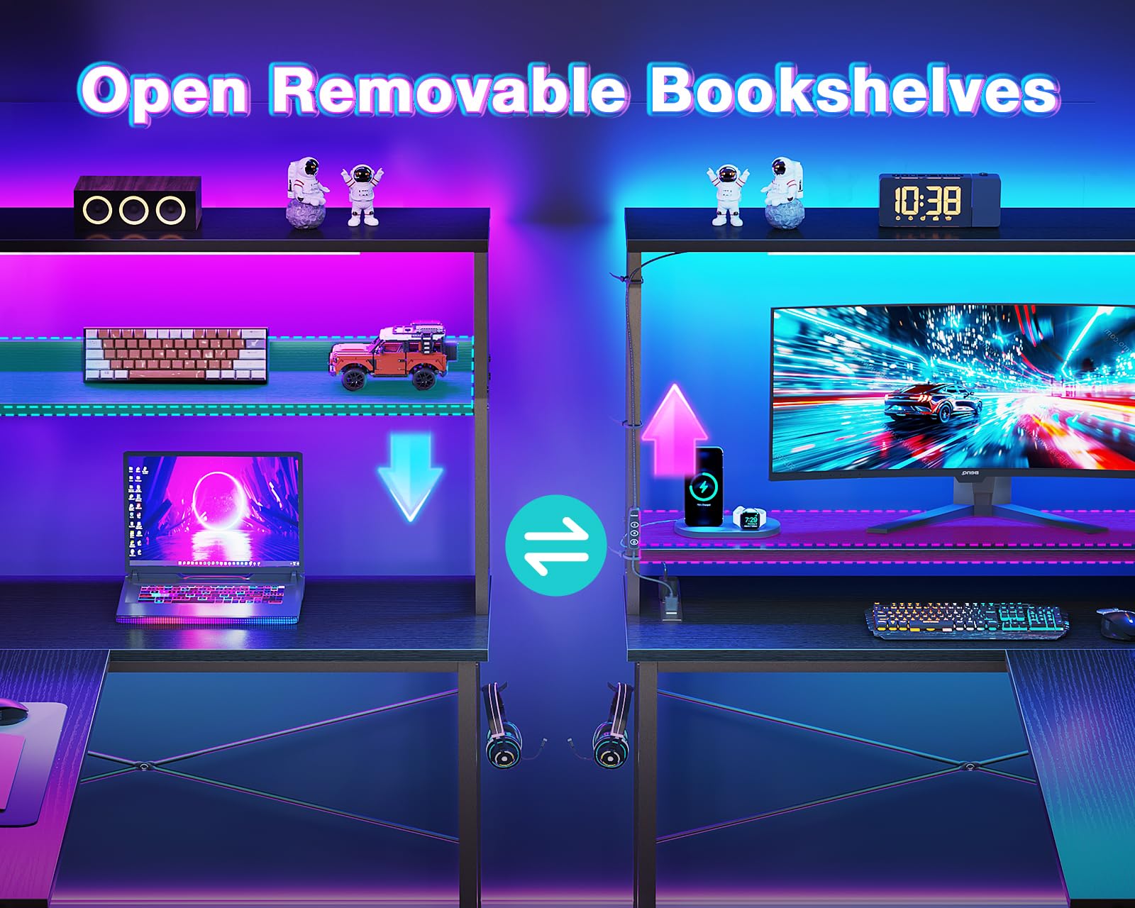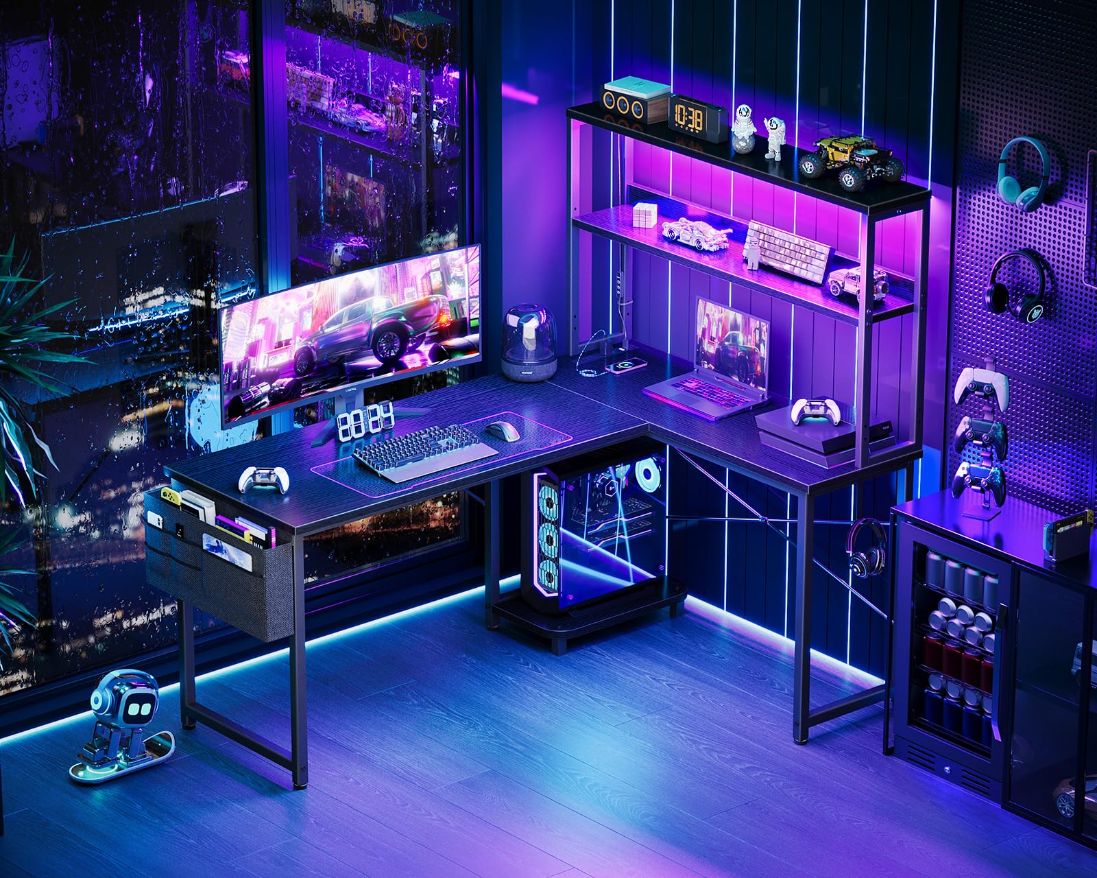 • 【AODK Reversible L Shape Desk】This L shaped gaming desk comes with storage shelves, power outlet, light strip, CPU stand, headphone hook and storage bag. The L desk is reversible and the top hutch can be fixed on the left or right side according to your needs, maximizing your limited space and ideal for corner spaces. A great choice for home office, game, office, studio and living room.