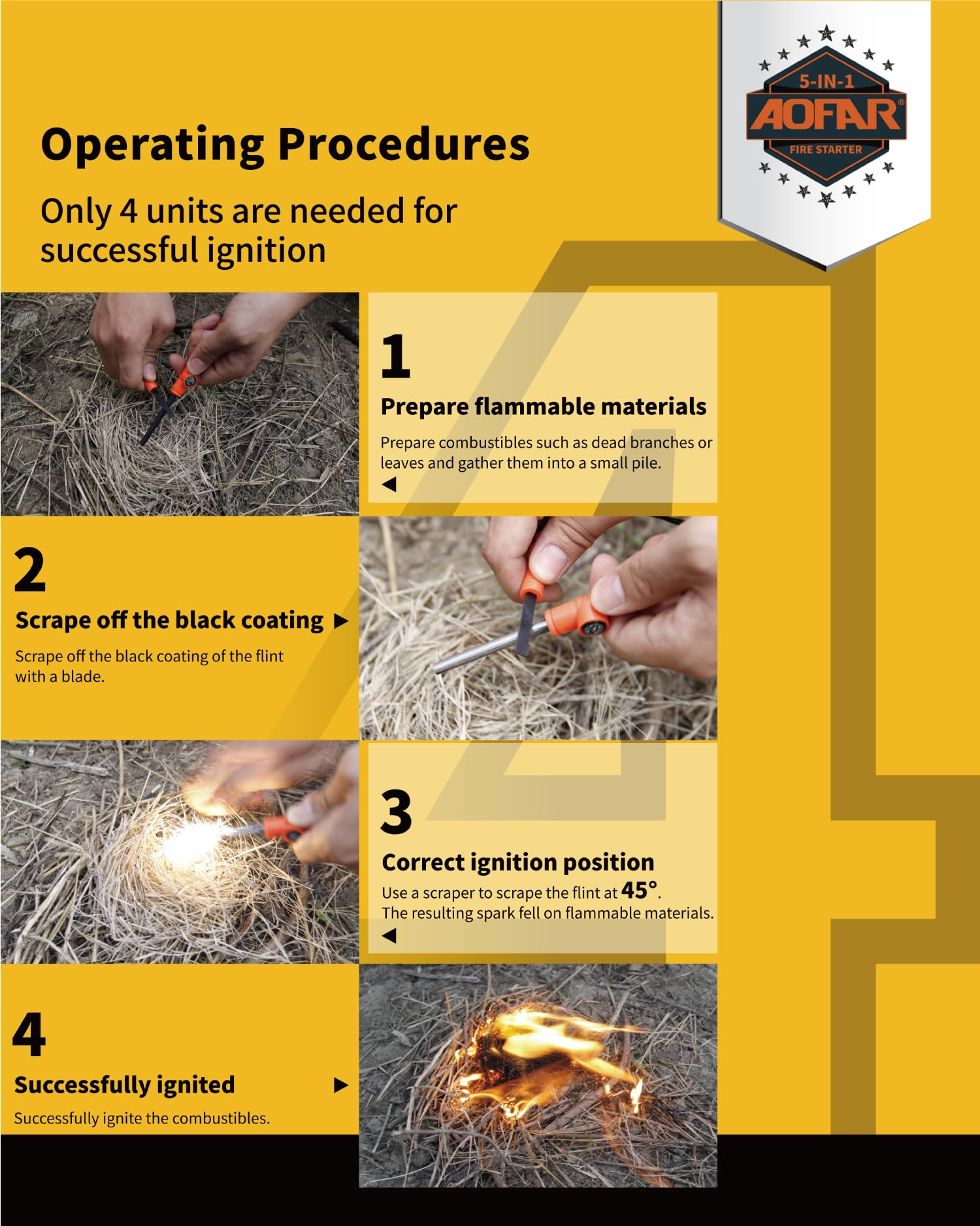 • MULTI-PURPOSE FLINT FIRE STEEL:3'Unique design scraper, 5'Rod,Match Survival Ropes,Compass,Emergency Whistle.