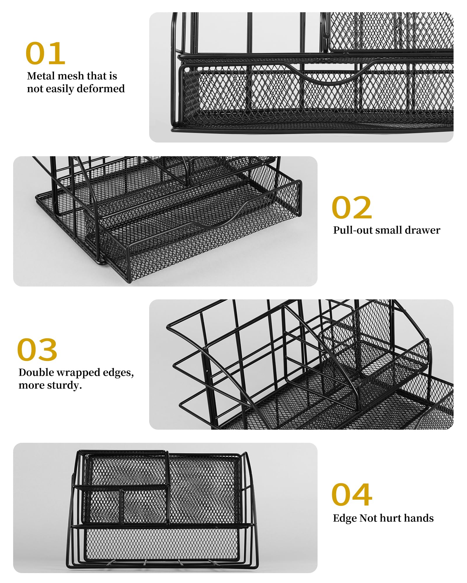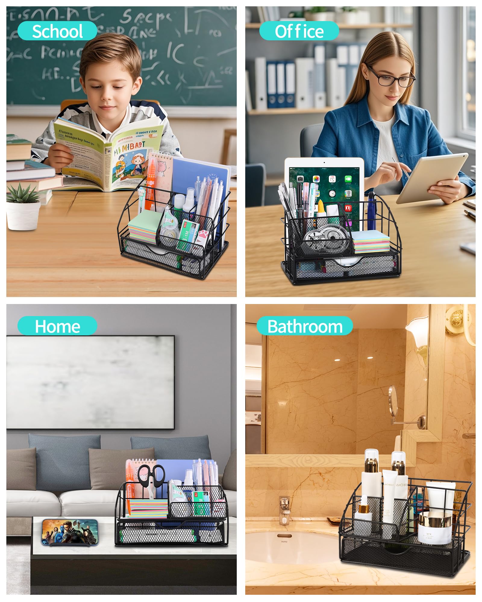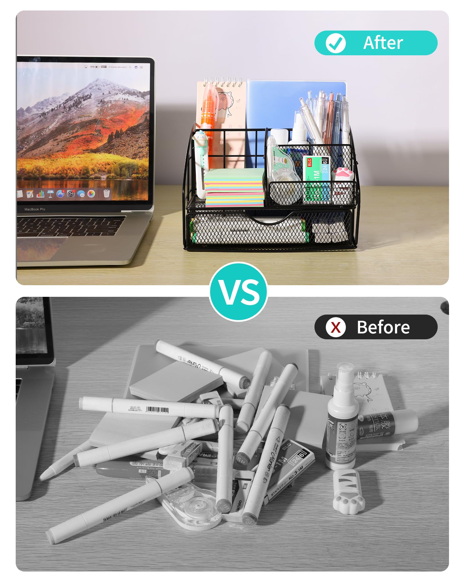 • Efficient Storage with Functional Design: The metal desk organizer features a practical mesh design that prevents dust accumulation while allowing clear visibility of contents. Its non-slip pads ensure stability on surfaces, while the compact size keeps supplies organized without overpowering your workspace. This user-friendly setup is ideal for sorting daily office supplies, crafting tools, or student essentials. The included stapler and binder clips enhance document organization